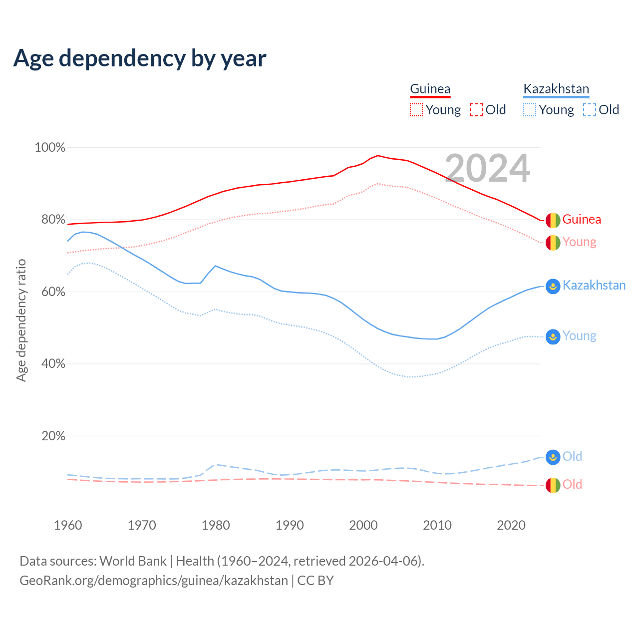 - Guinea is ranked 176/196 by median age (oldest to youngest) vs 99/196 for Kazakhstan.