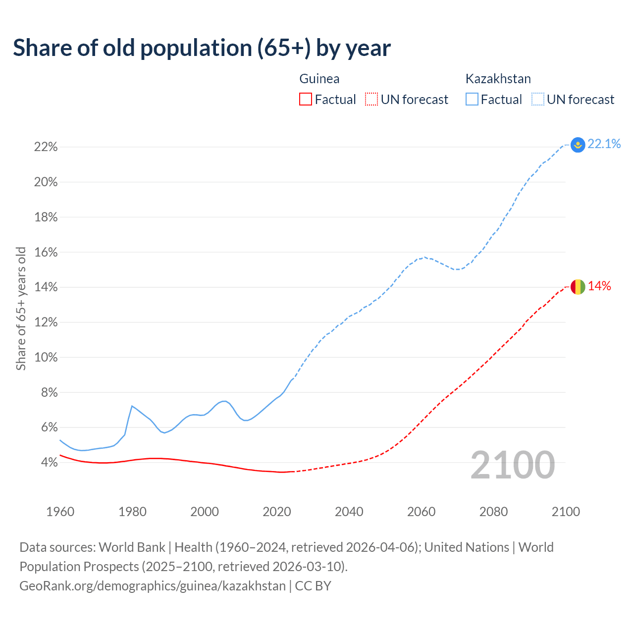 The share of older people aged 65 and over is 3.46% in Guinea and 8.65% in Kazakhstan. Life expectancy in Guinea compared to Kazakhstan .