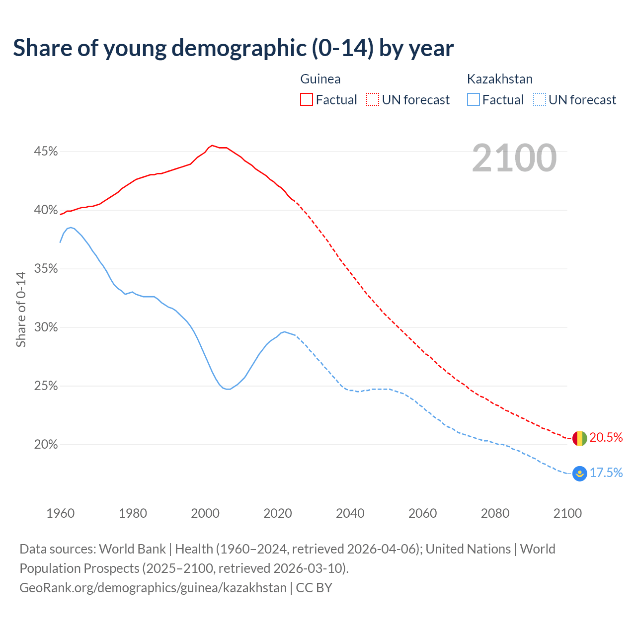 - The share of young demographic (0-15 years old) in Guinea is 40.9% vs 29.4% in Kazakhstan.