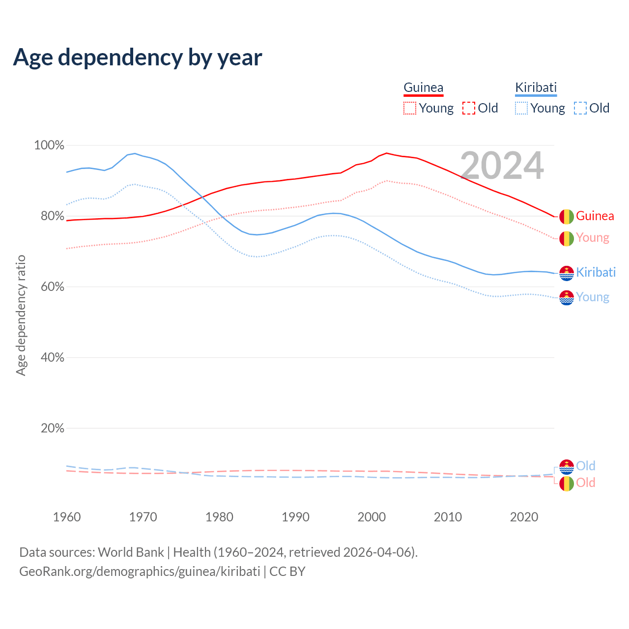 - The share of old-age demographic (65+) in Guinea is 3.46% vs 4.24% in Kiribati.