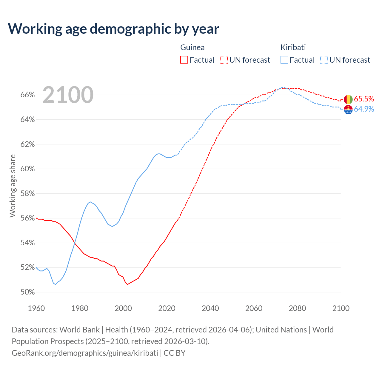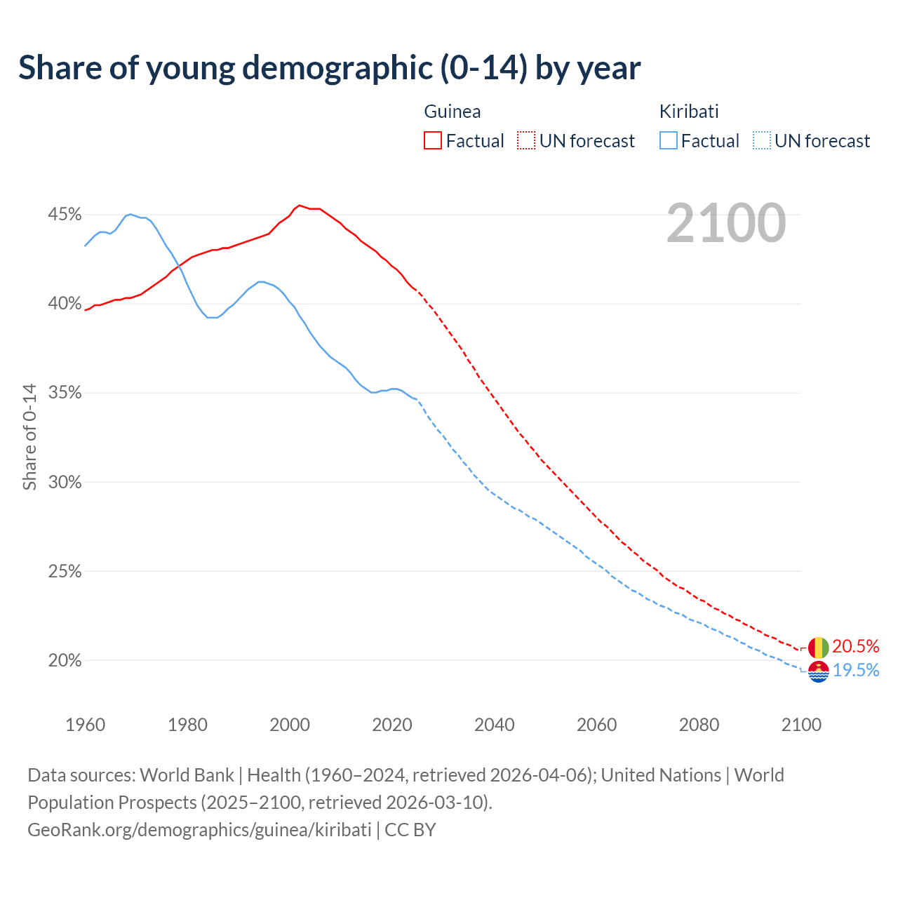 Median age Guinea vs Kiribati, 1960-2100