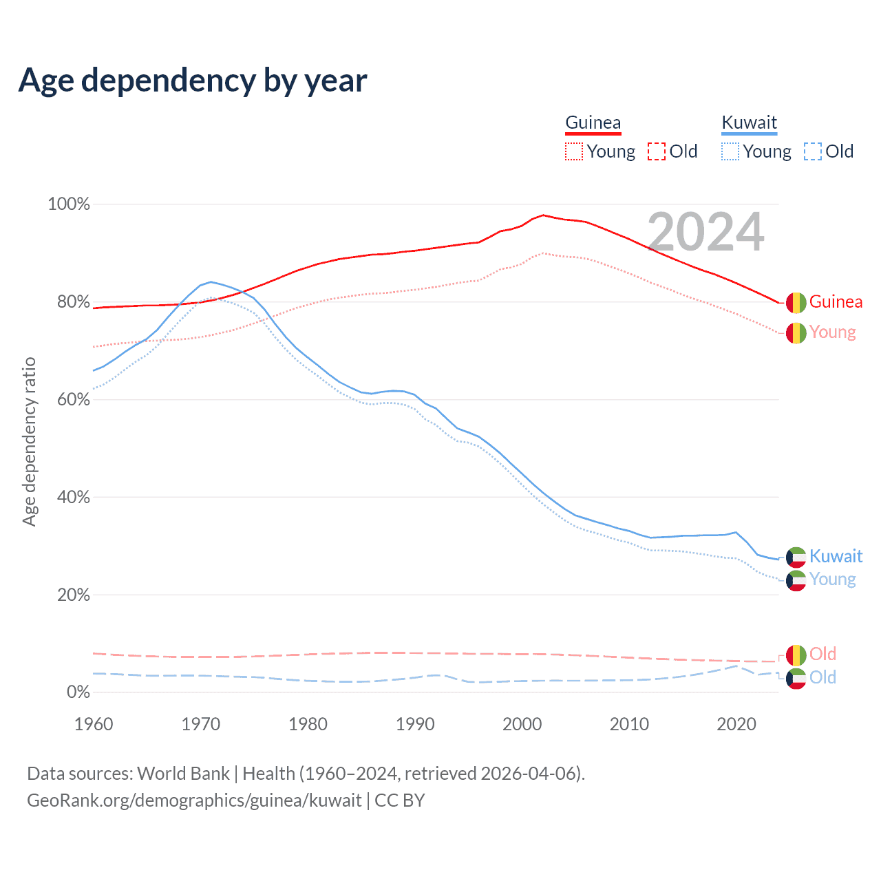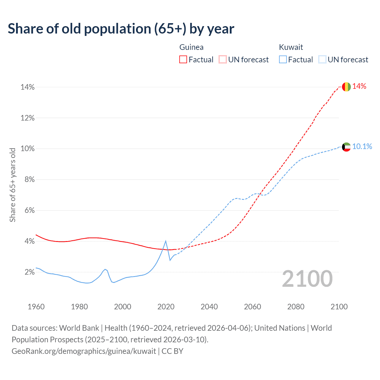 The share of older people aged 65 and over is 3.46% in Guinea and 3.1% in Kuwait. Life expectancy in Guinea compared to Kuwait .