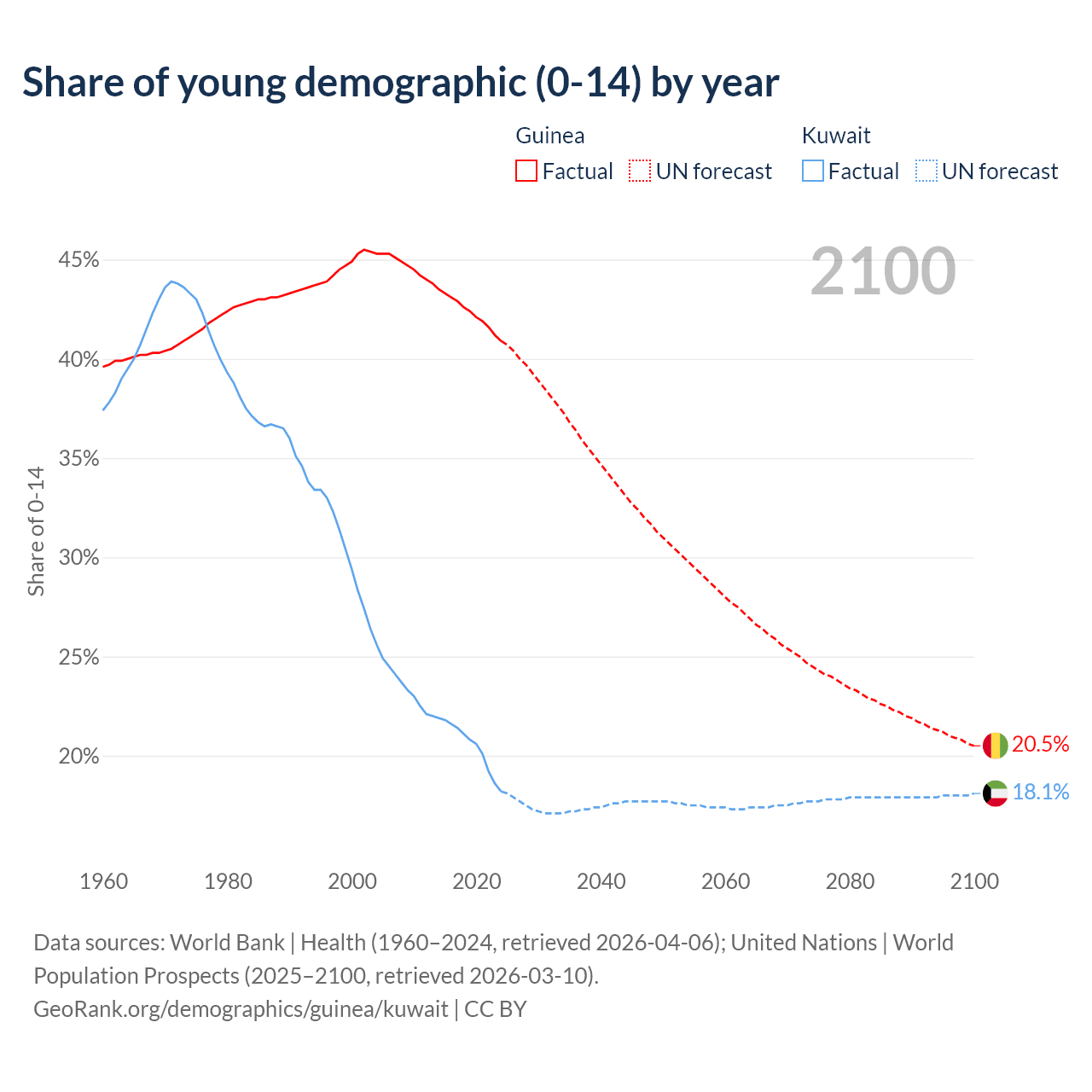 - The share of young demographic (0-15 years old) in Guinea is 40.9% vs 18.2% in Kuwait.