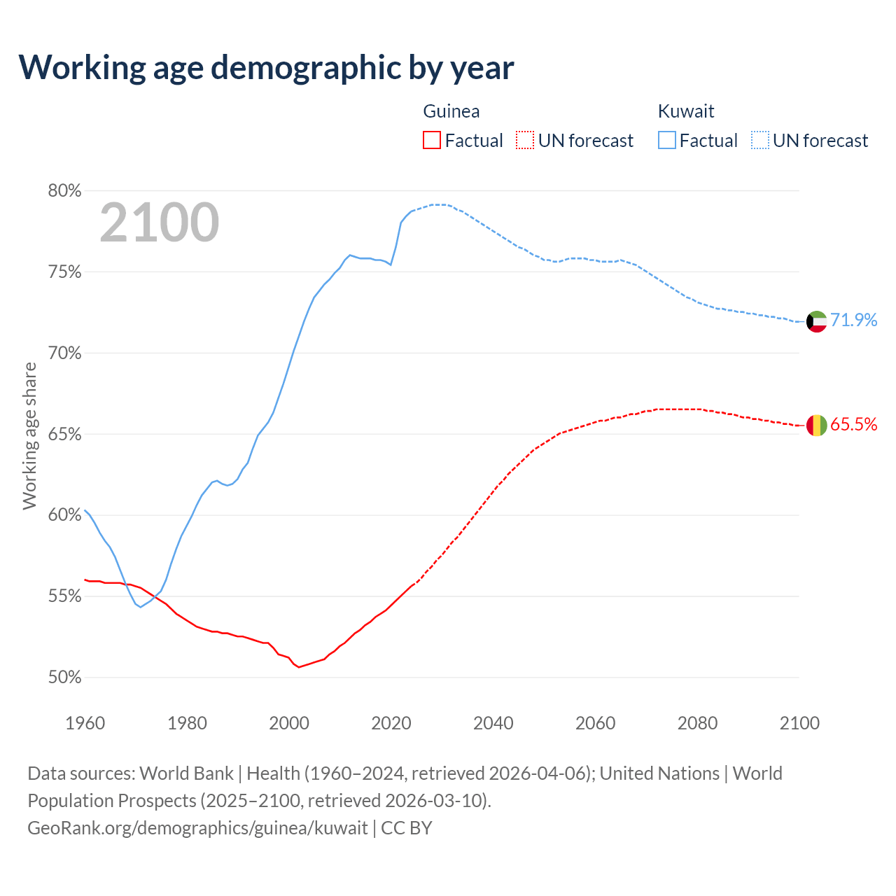 Median age Guinea vs Kuwait, 1960-2100