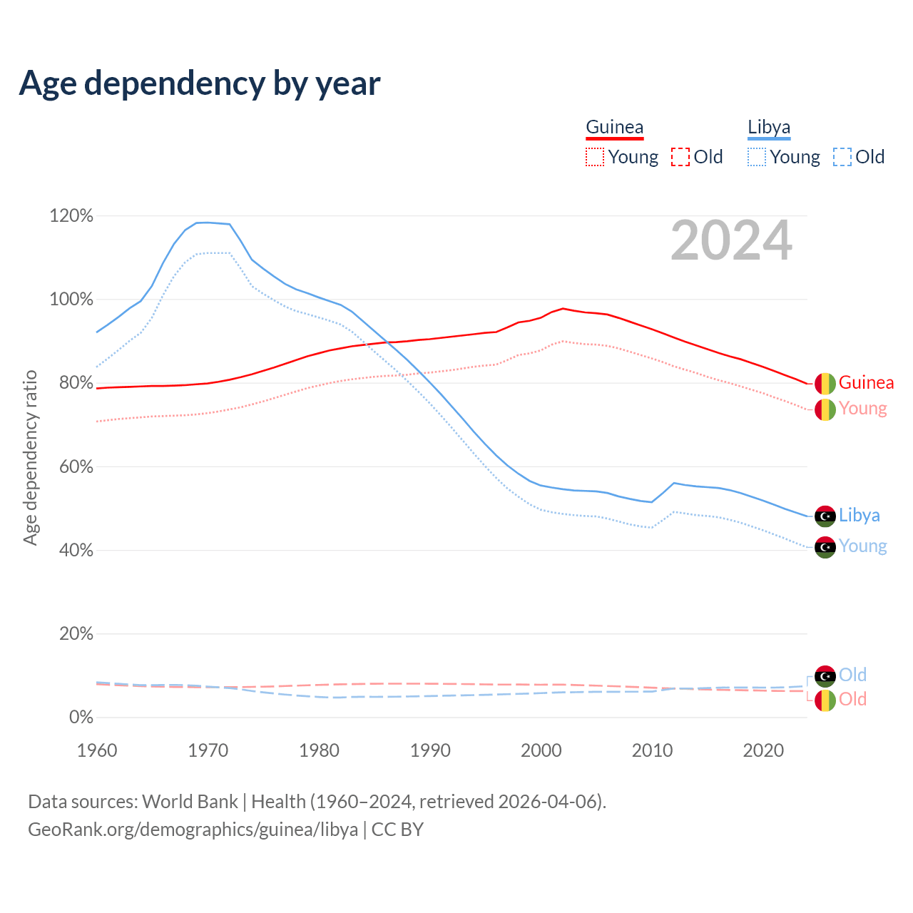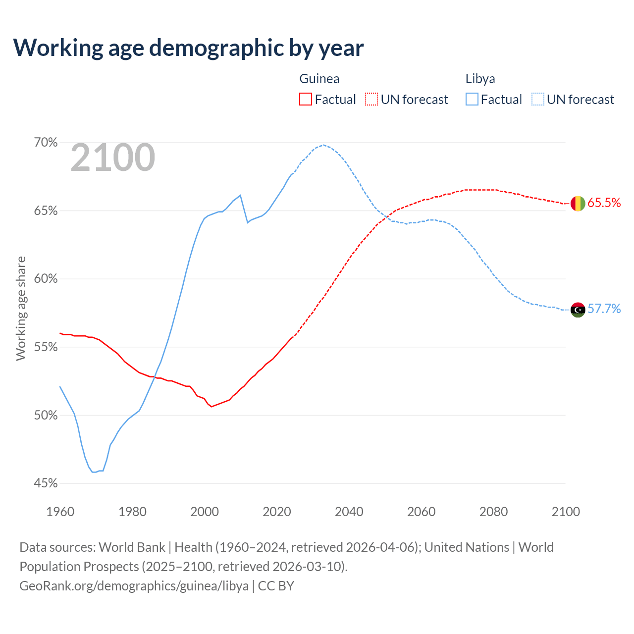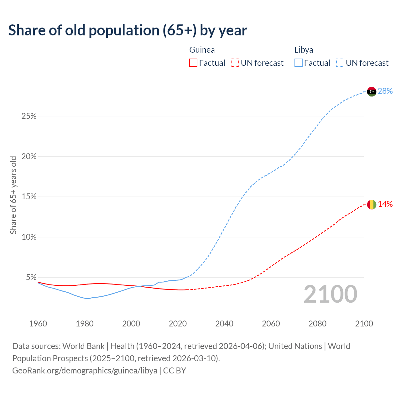The share of older people aged 65 and over is 3.46% in Guinea and 5.02% in Libya. Life expectancy in Guinea compared to Libya .