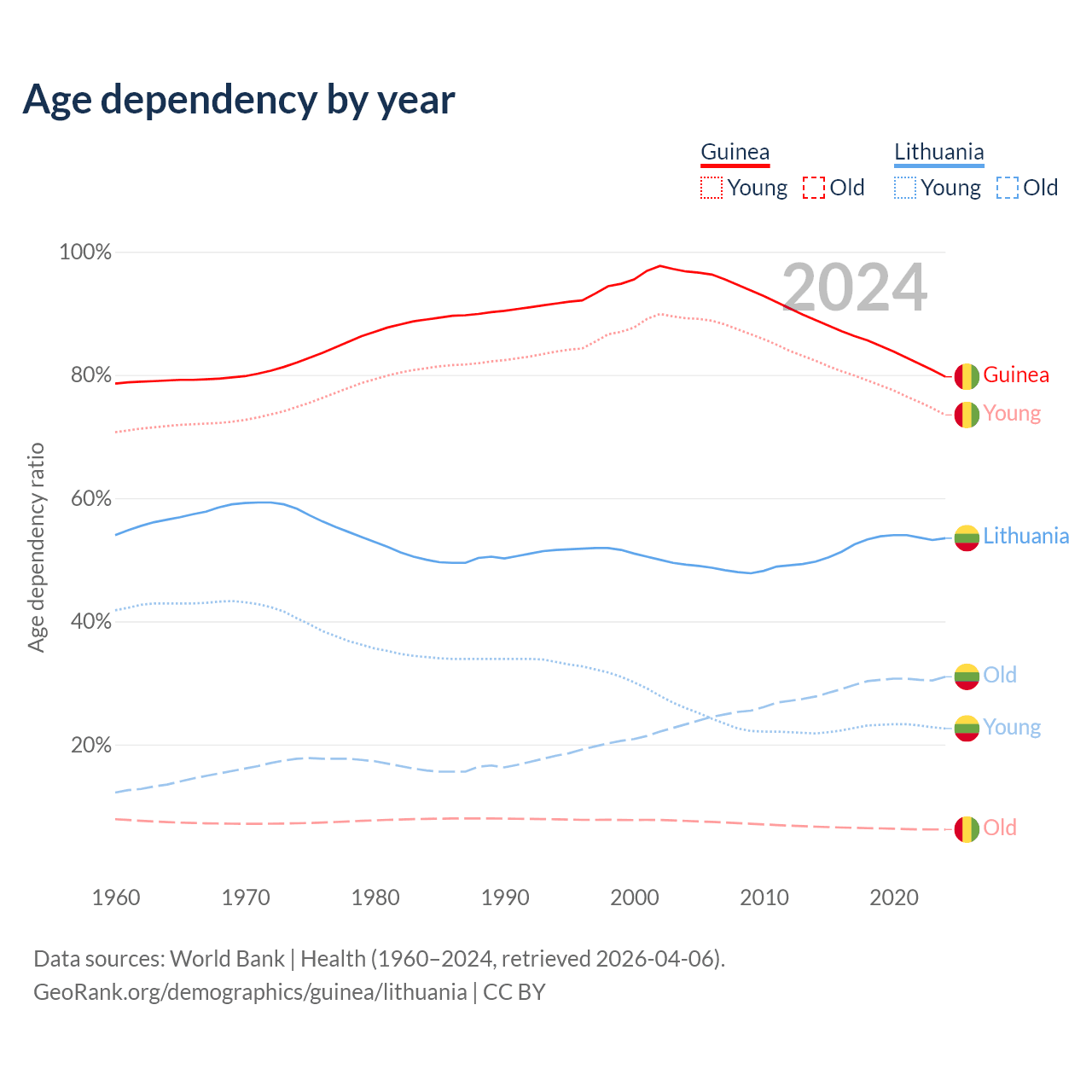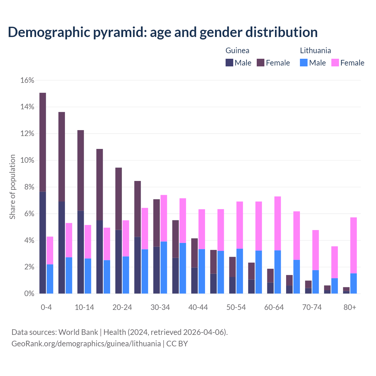 - The share of old-age demographic (65+) in Guinea is 3.46% vs 20.2% in Lithuania.