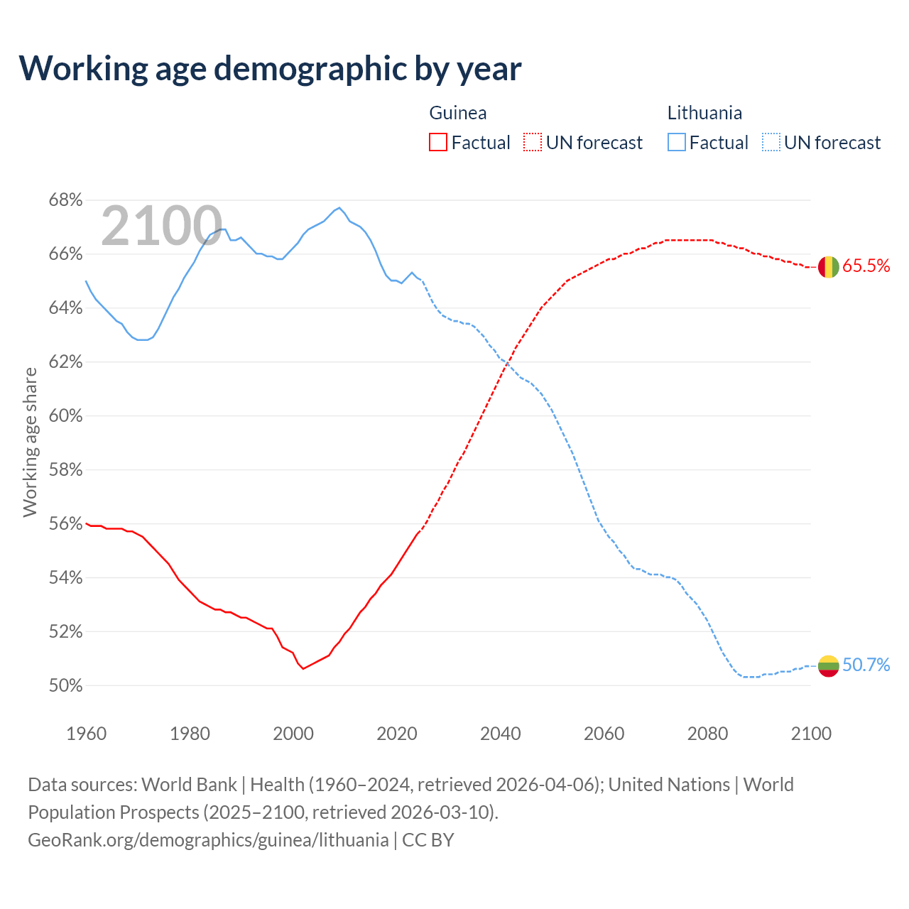 Median age Guinea vs Lithuania, 1960-2100