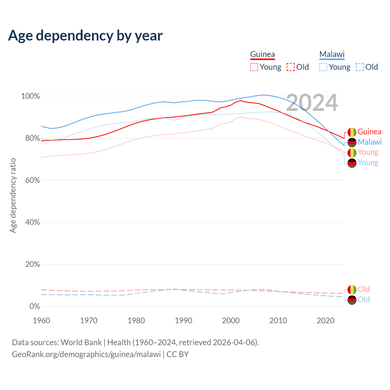 - Guinea is ranked 176/196 by median age (oldest to youngest) vs 181/196 for Malawi.