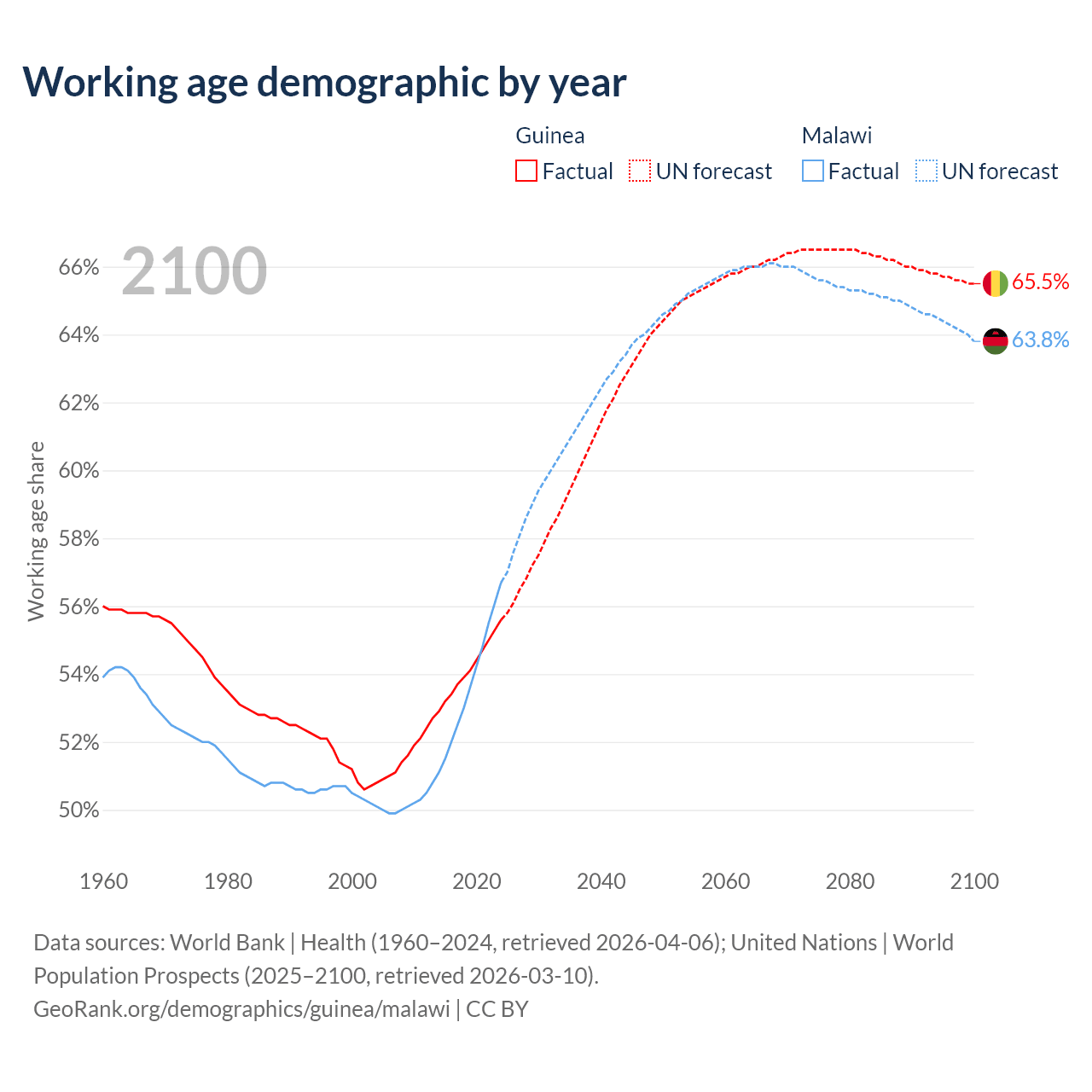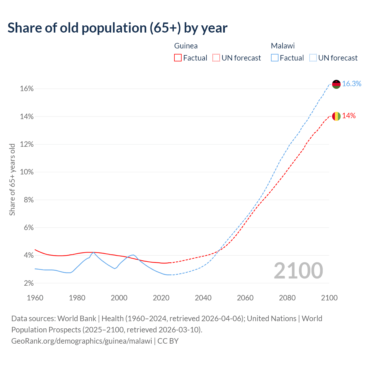 - The share of old-age demographic (65+) in Guinea is 3.46% vs 2.59% in Malawi.