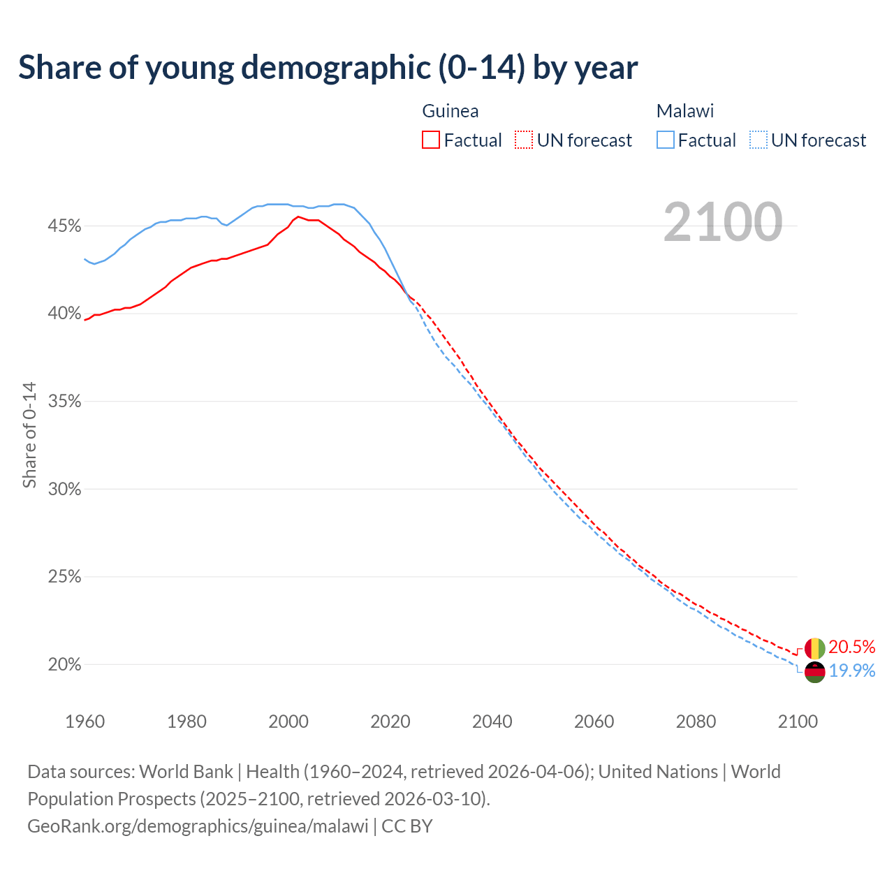 - The share of young demographic (0-15 years old) in Guinea is 40.9% vs 40.7% in Malawi.