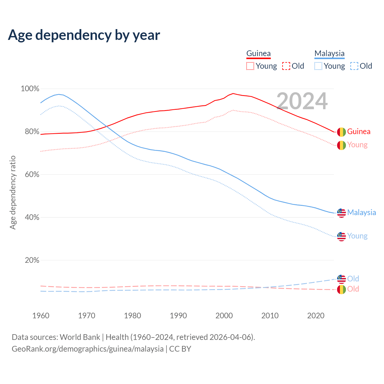 - Guinea is ranked 176/196 by median age (oldest to youngest) vs 92/196 for Malaysia.
