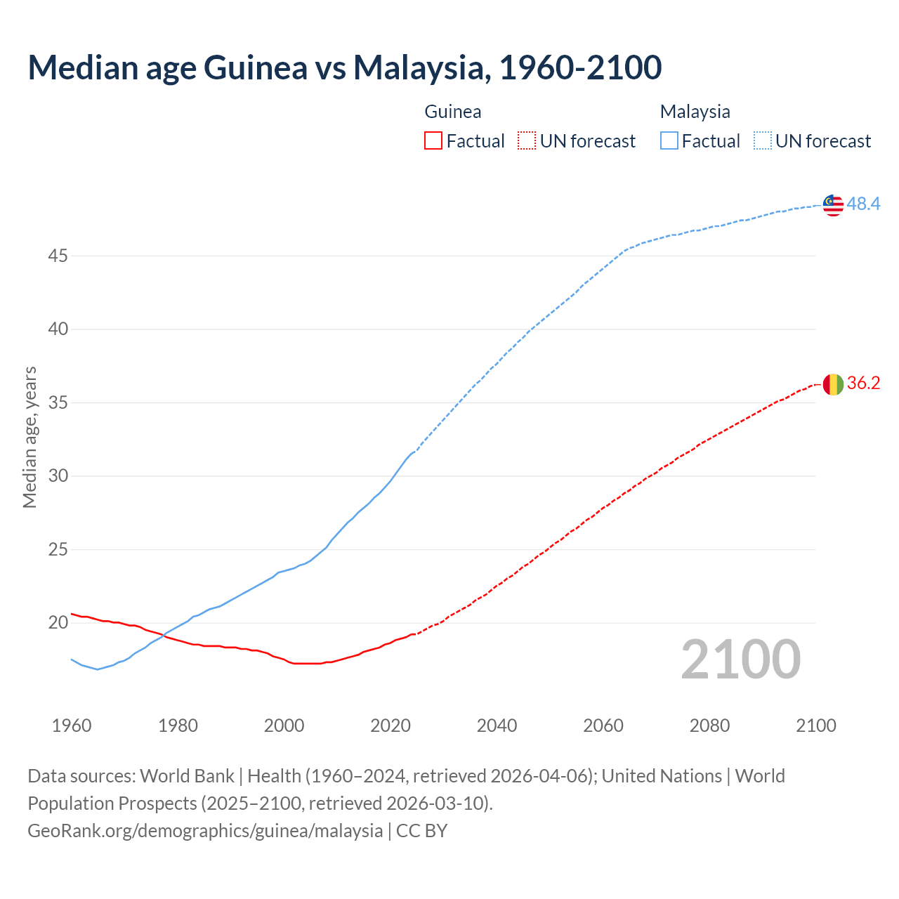 Median age Guinea vs Malaysia, 1960-2100