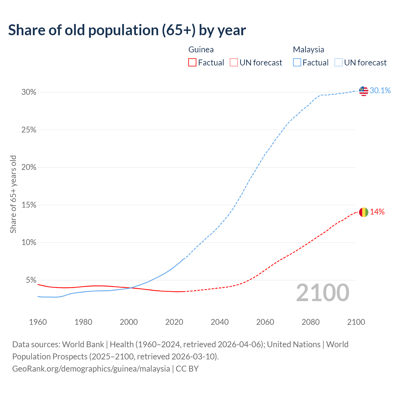 The share of older people aged 65 and over is 3.46% in Guinea and 7.74% in Malaysia. Life expectancy in Guinea compared to Malaysia .