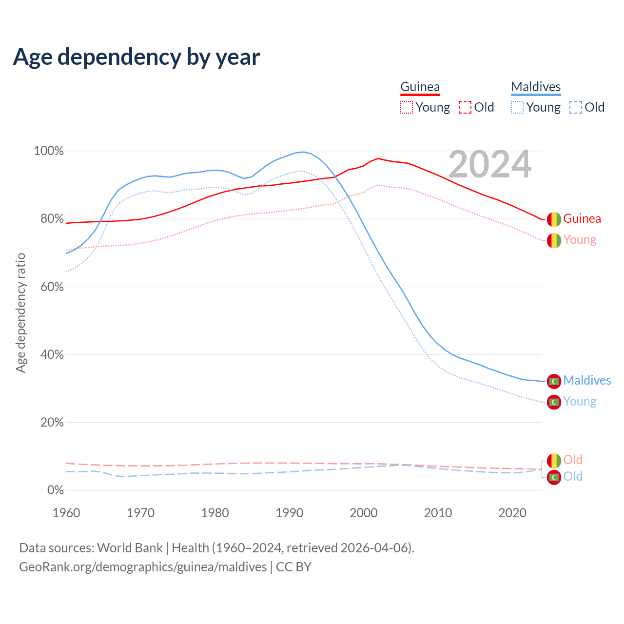- The share of old-age demographic (65+) in Guinea is 3.46% vs 4.64% in Maldives.