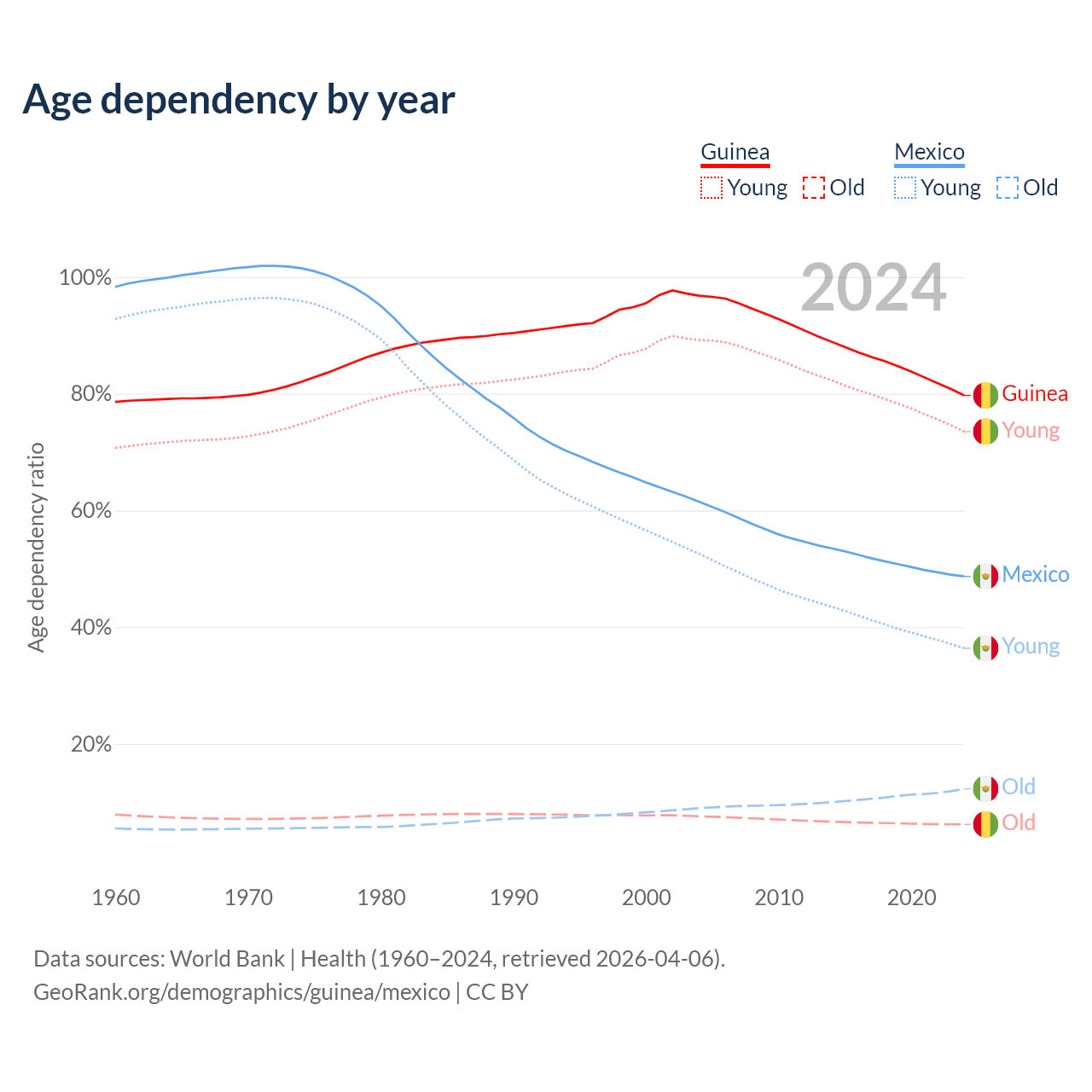 - The share of old-age demographic (65+) in Guinea is 3.46% vs 8.25% in Mexico.