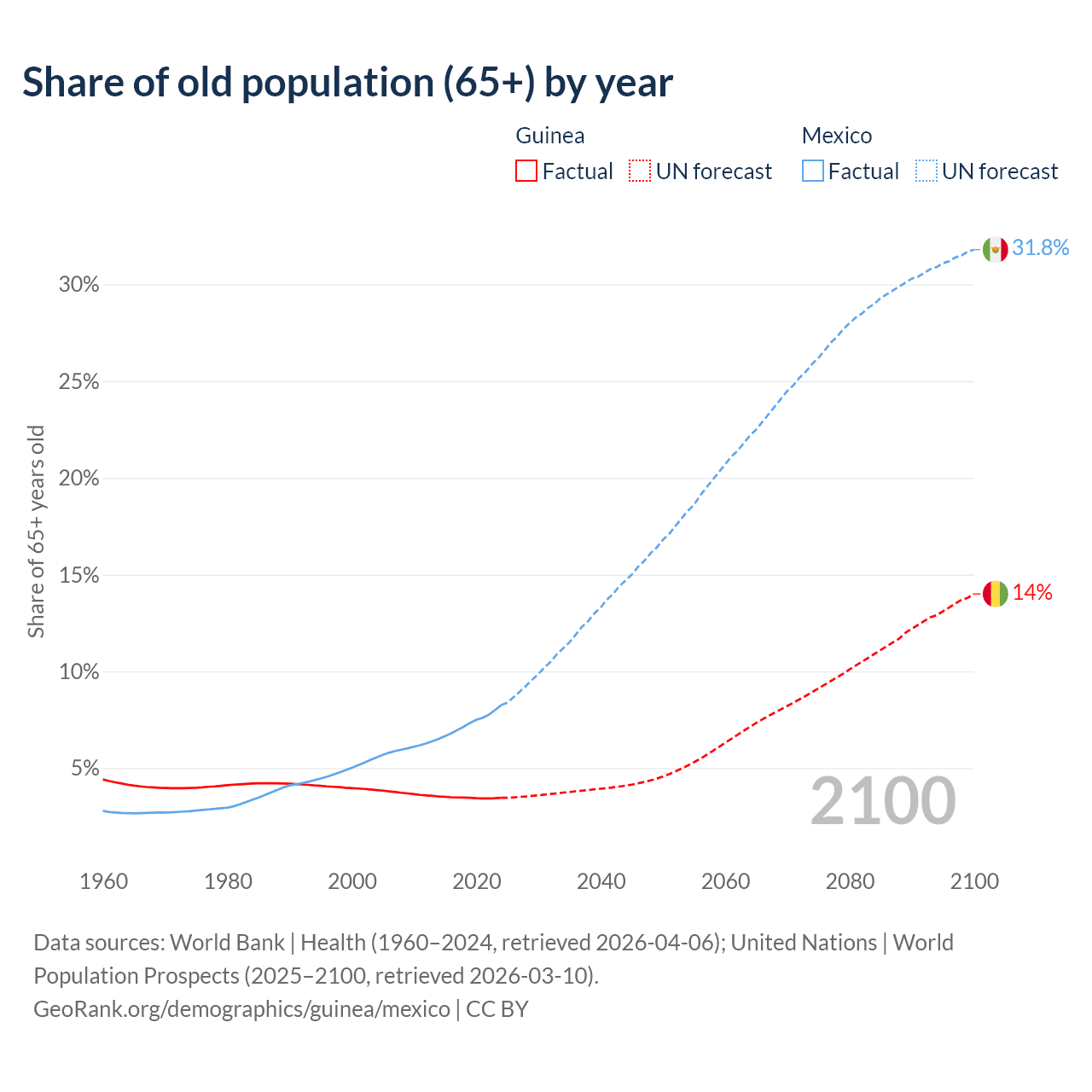 The share of older people aged 65 and over is 3.46% in Guinea and 8.25% in Mexico. Life expectancy in Guinea compared to Mexico .