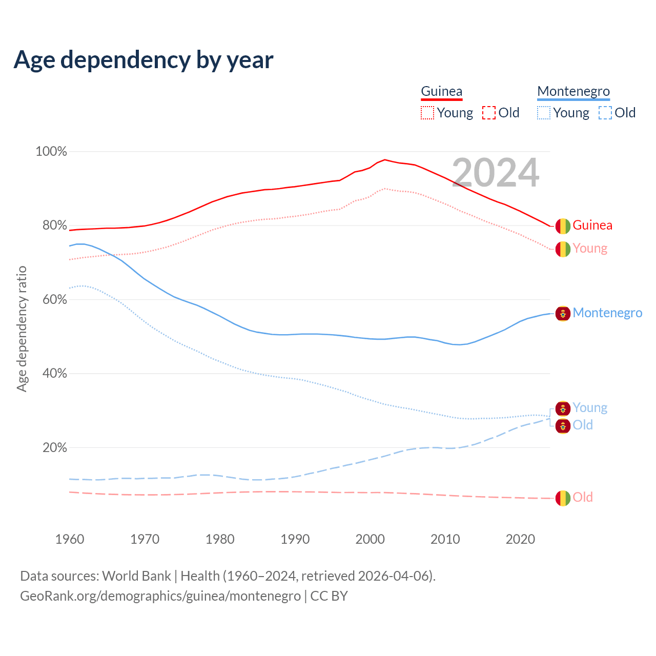 - The share of old-age demographic (65+) in Guinea is 3.46% vs 17.8% in Montenegro.