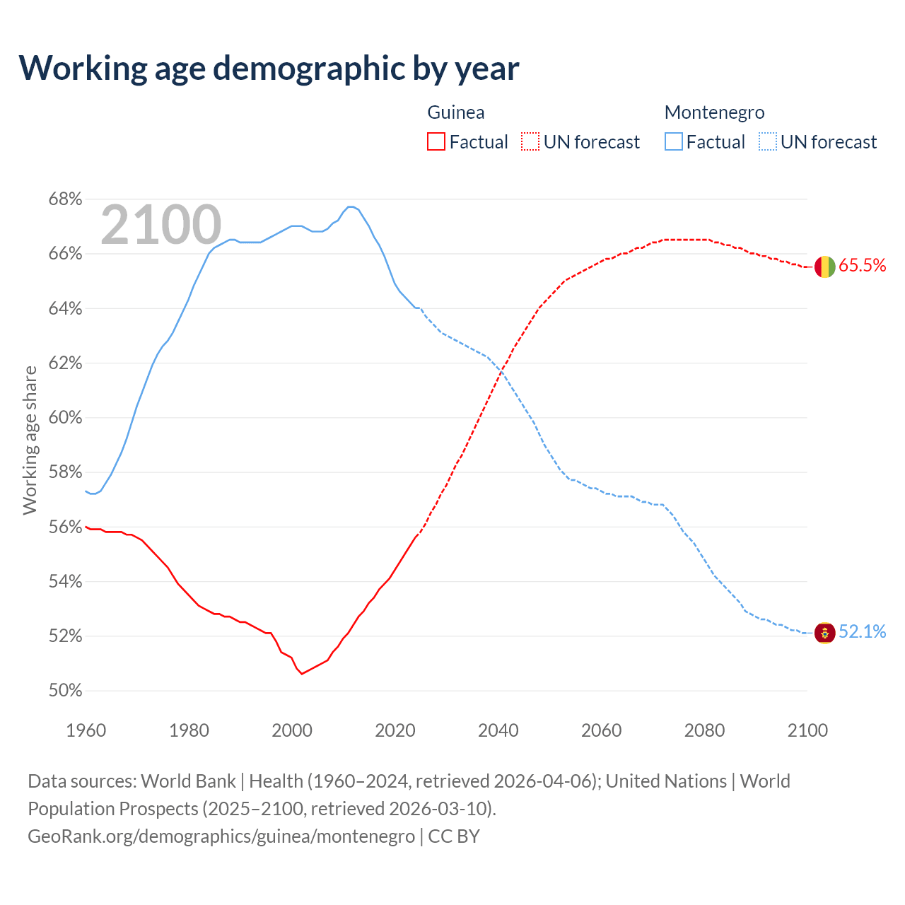 - The share of young demographic (0-15 years old) in Guinea is 40.9% vs 18.1% in Montenegro.