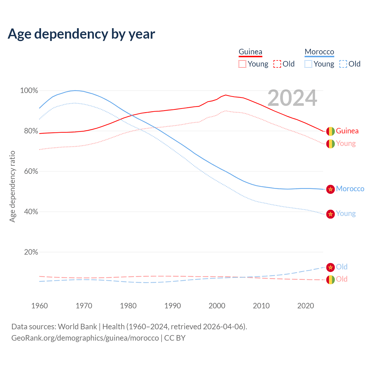 - Guinea is ranked 176/196 by median age (oldest to youngest) vs 100/196 for Morocco.