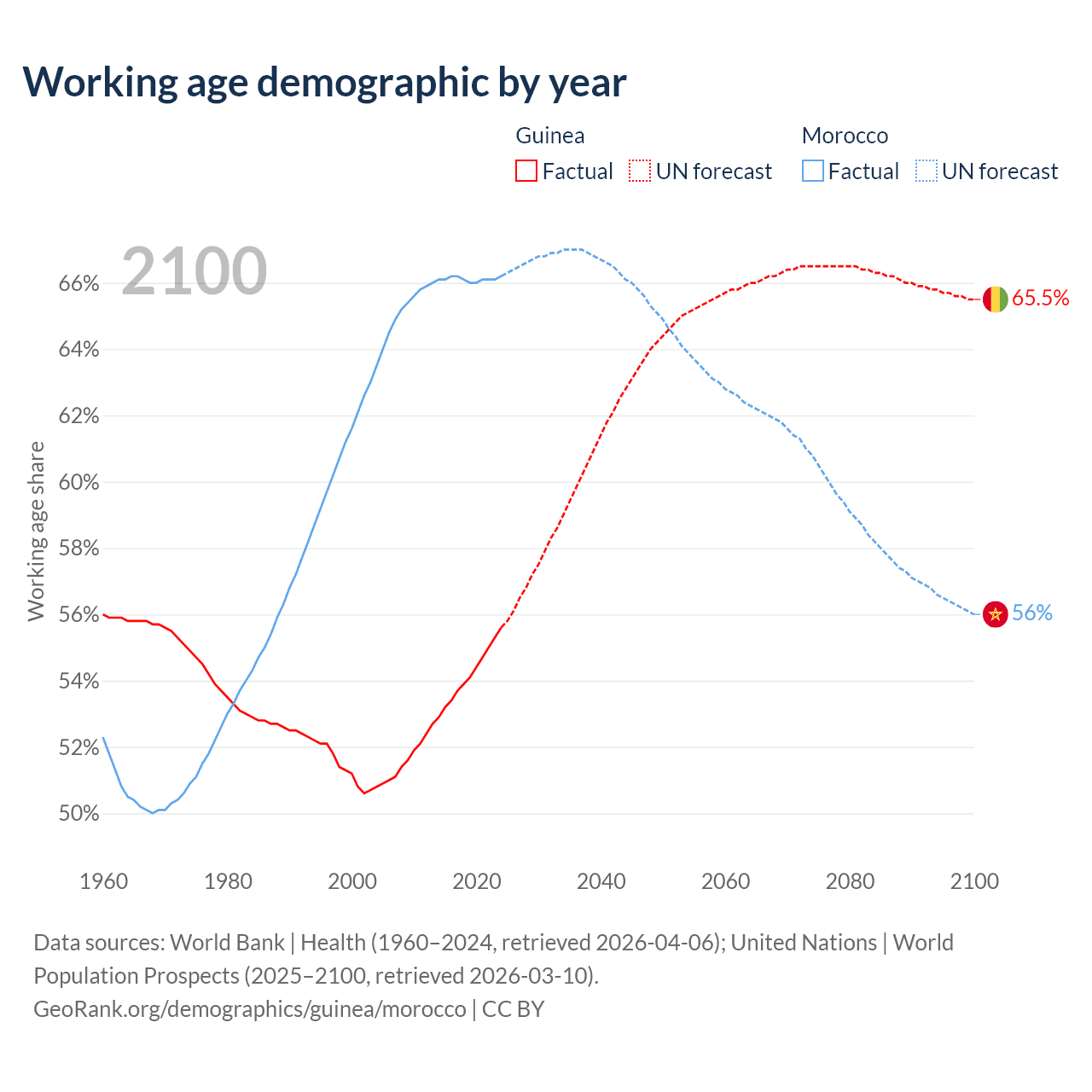 - As of 2026, the population of Guinea is 15.5M vs 38.9M in Morocco - 2.5 times difference.
