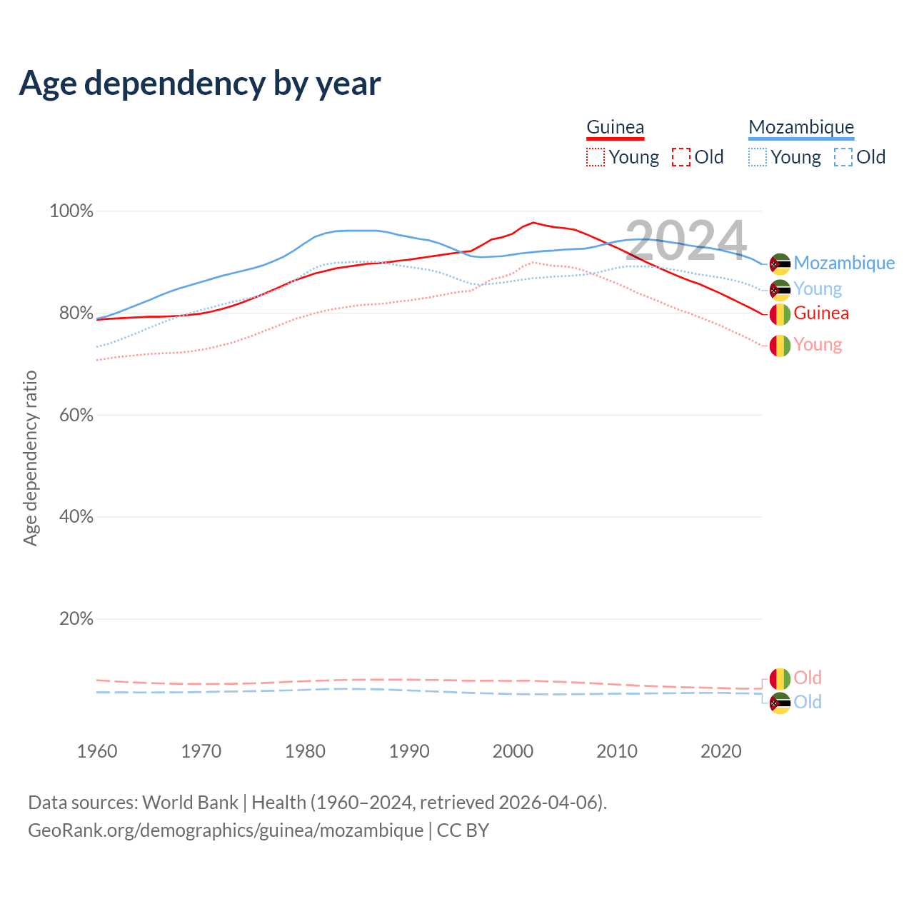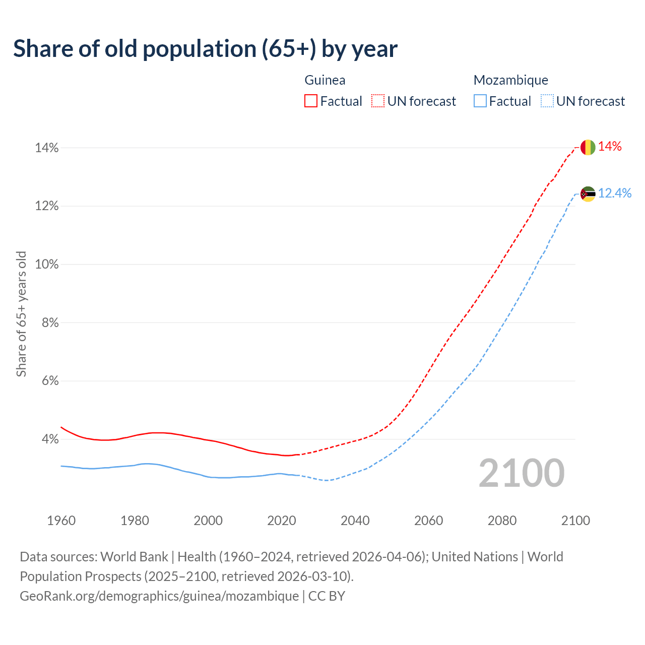 - The share of old-age demographic (65+) in Guinea is 3.46% vs 2.75% in Mozambique.