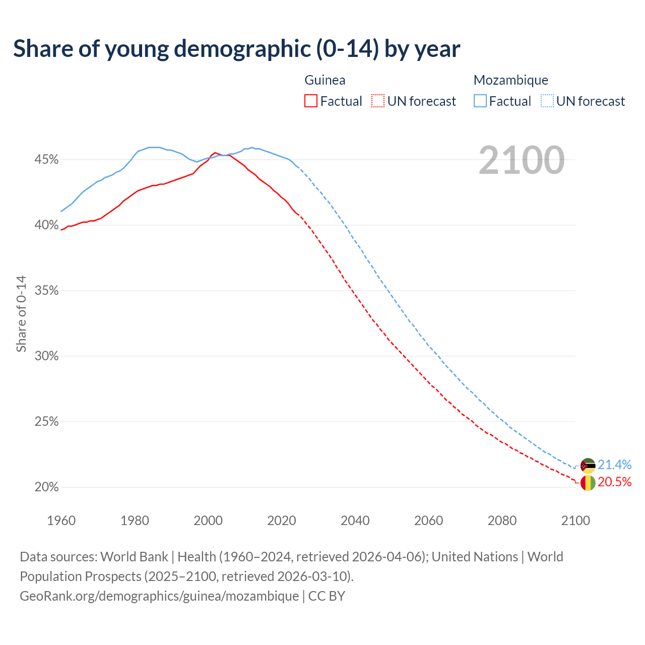 Median age Guinea vs Mozambique, 1960-2100