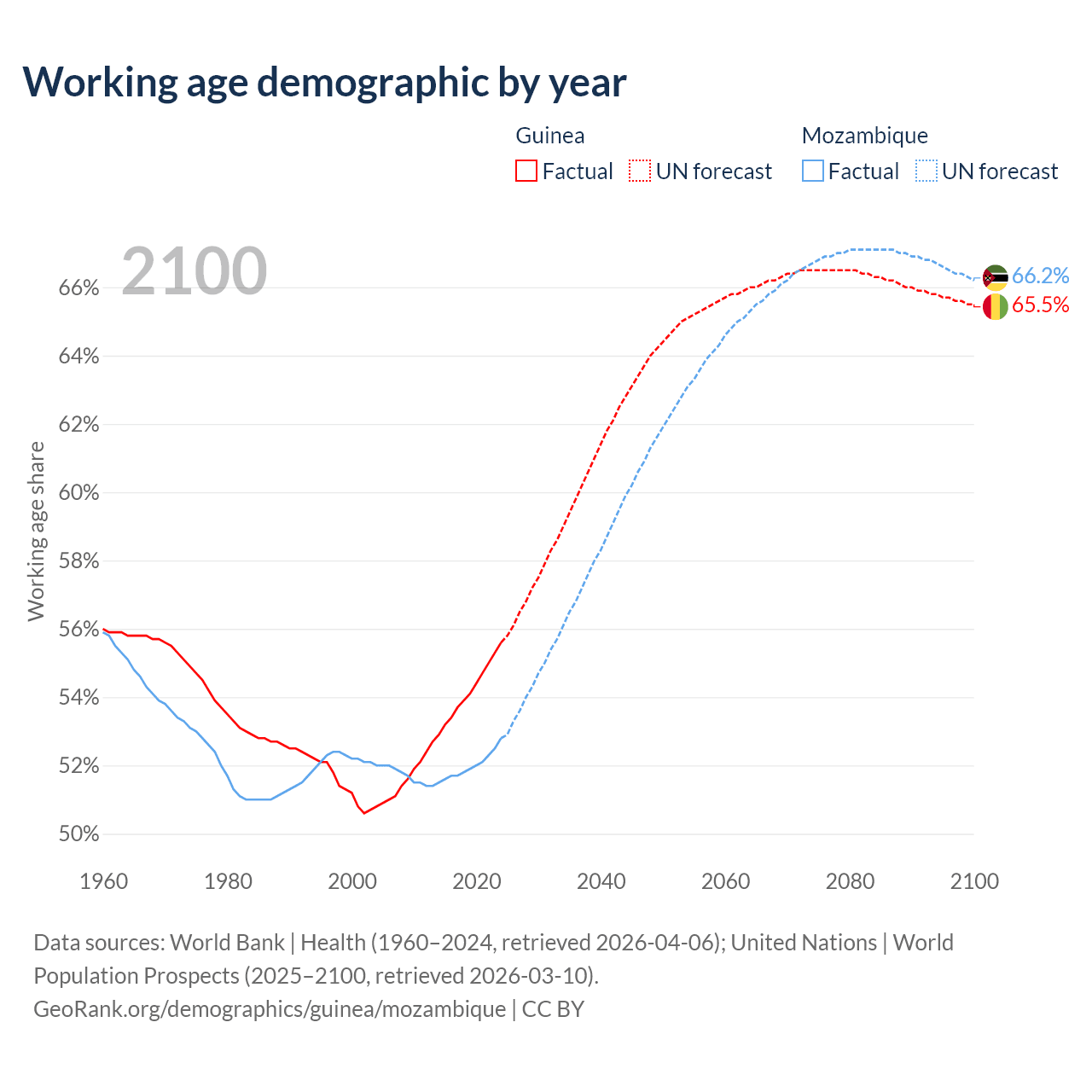 The share of older people aged 65 and over is 3.46% in Guinea and 2.75% in Mozambique. Life expectancy in Guinea compared to Mozambique .