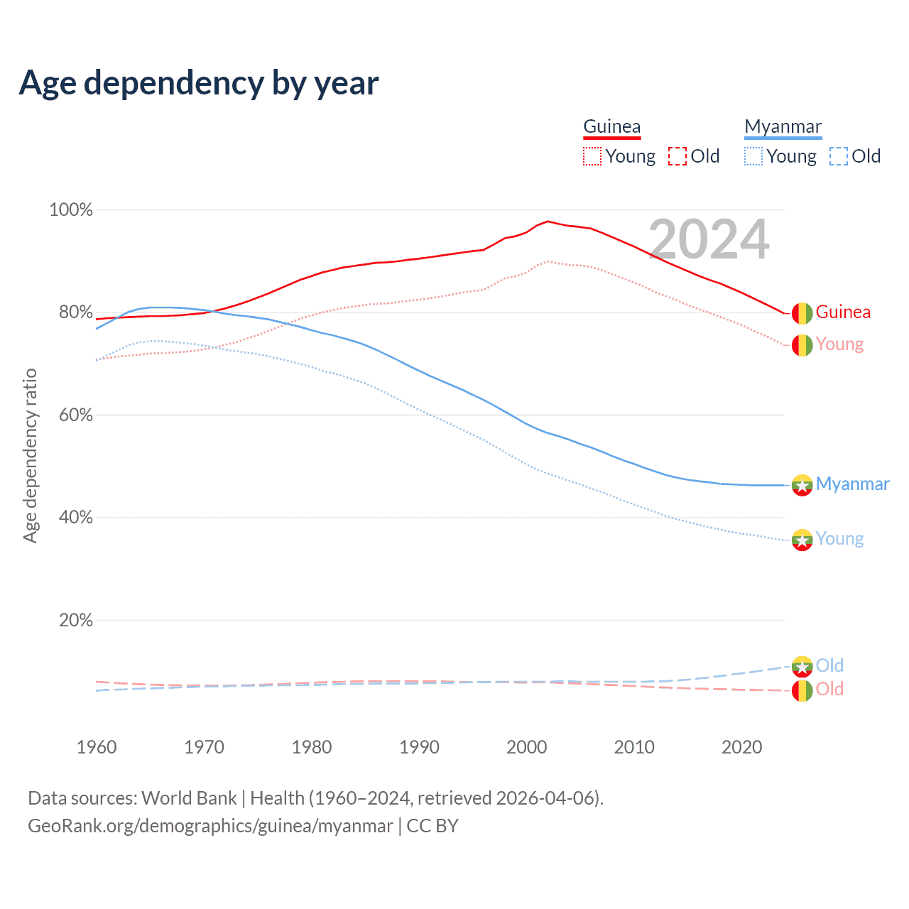 The share of older people aged 65 and over is 3.46% in Guinea and 7.3% in Myanmar. Life expectancy in Guinea compared to Myanmar .
