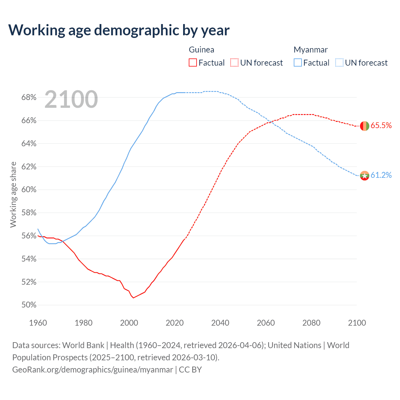 Median age Guinea vs Myanmar, 1960-2100