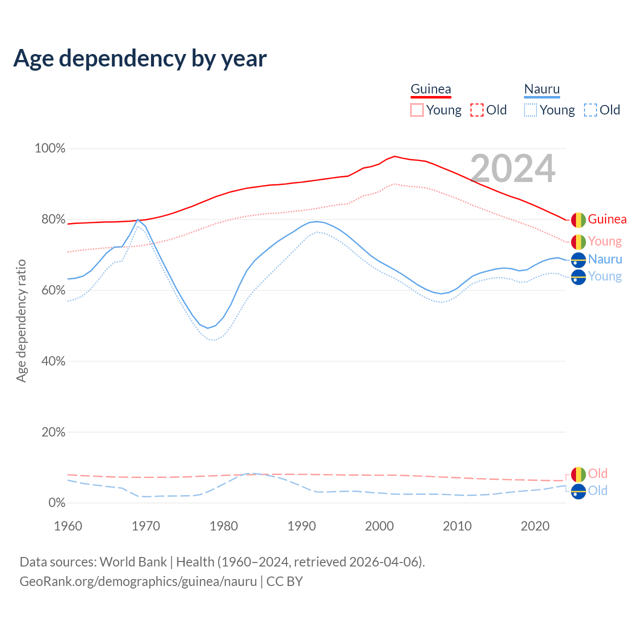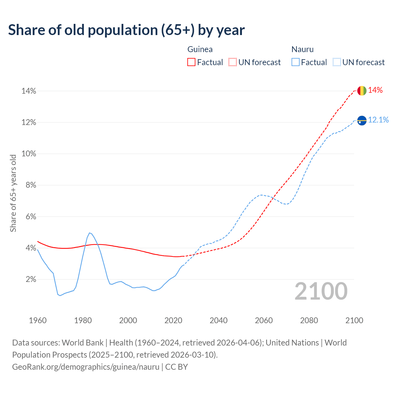 - The share of old-age demographic (65+) in Guinea is 3.46% vs 2.85% in Nauru.