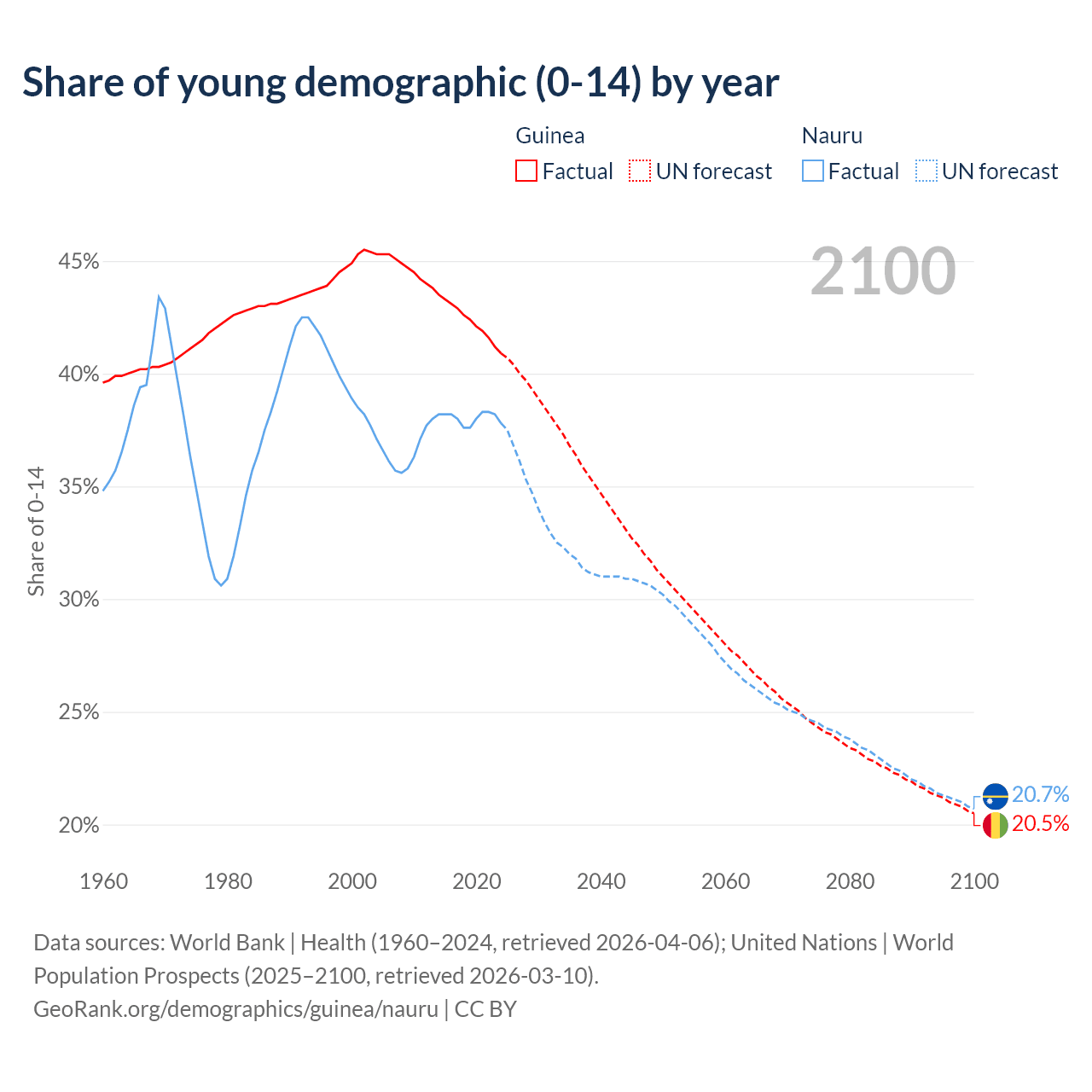- The share of young demographic (0-15 years old) in Guinea is 40.9% vs 37.8% in Nauru.