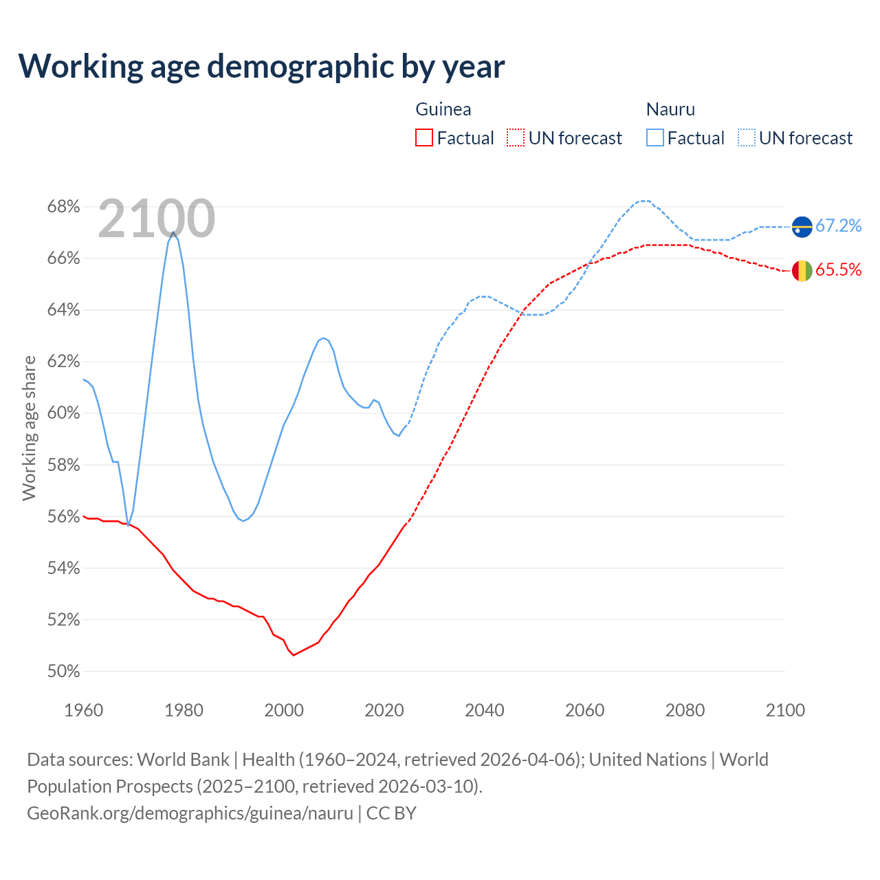 - Guinea has 8.65M working age adults (aged 15-64) vs 7.2K in Nauru.