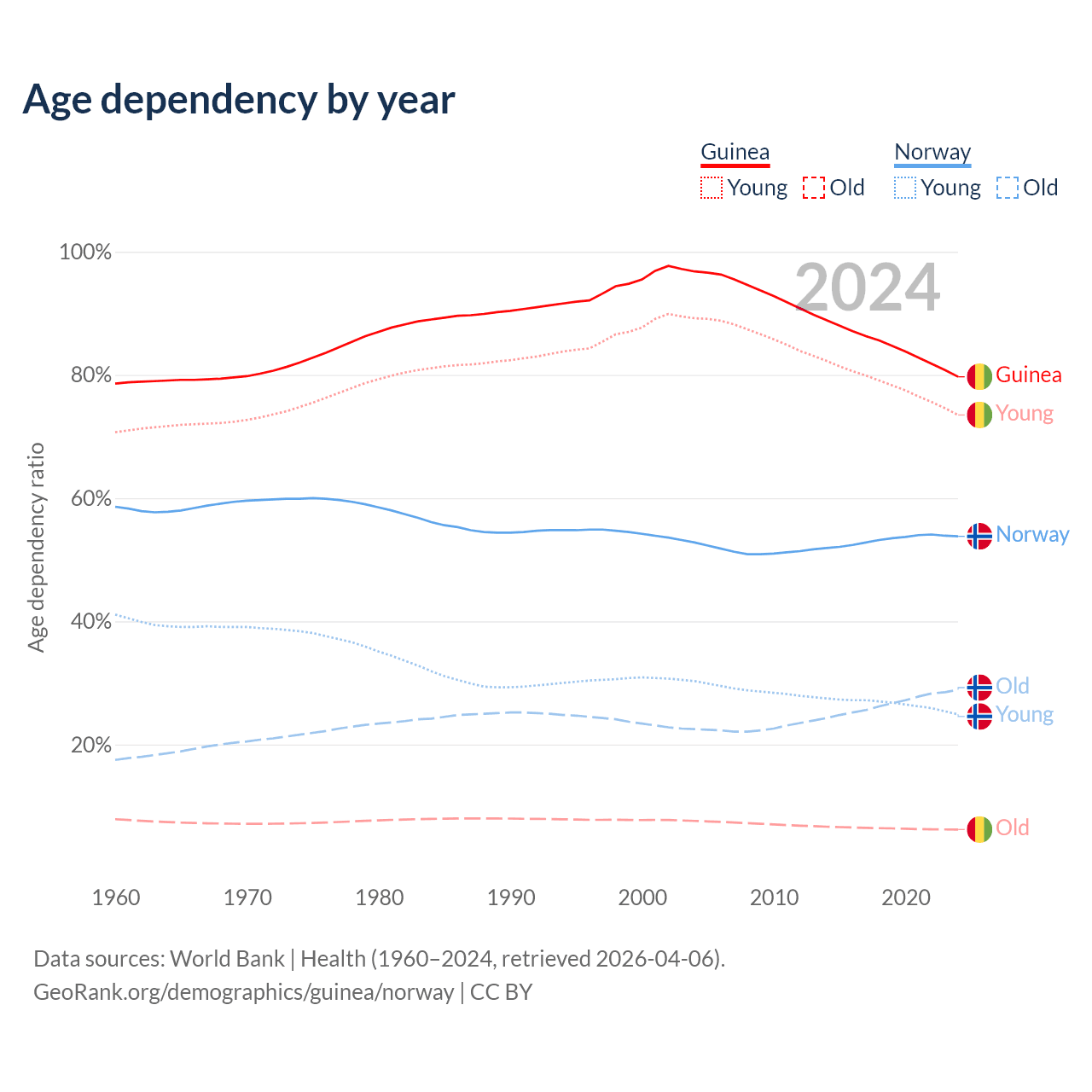 The share of older people aged 65 and over is 3.46% in Guinea and 18.8% in Norway. Life expectancy in Guinea compared to Norway .