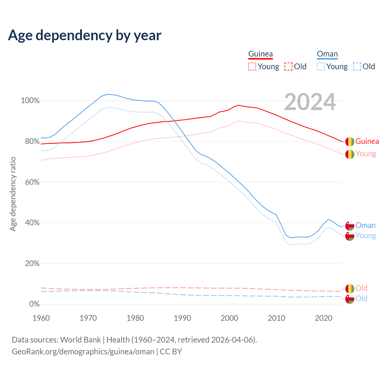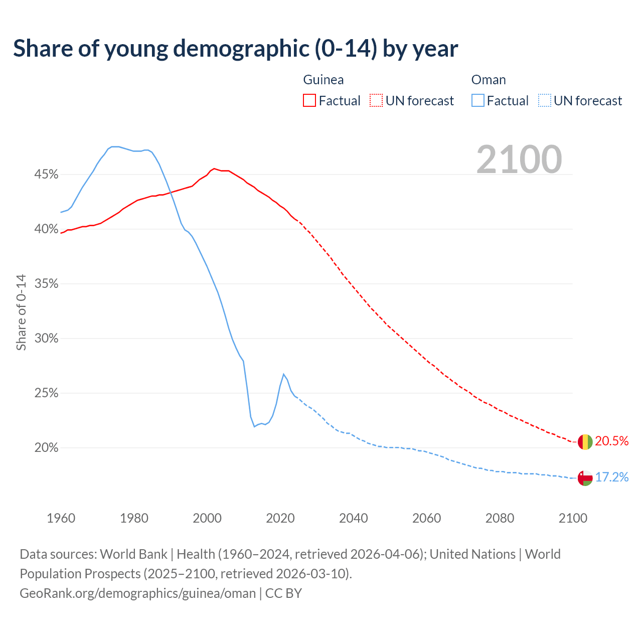 - The share of young demographic (0-15 years old) in Guinea is 40.9% vs 24.7% in Oman.