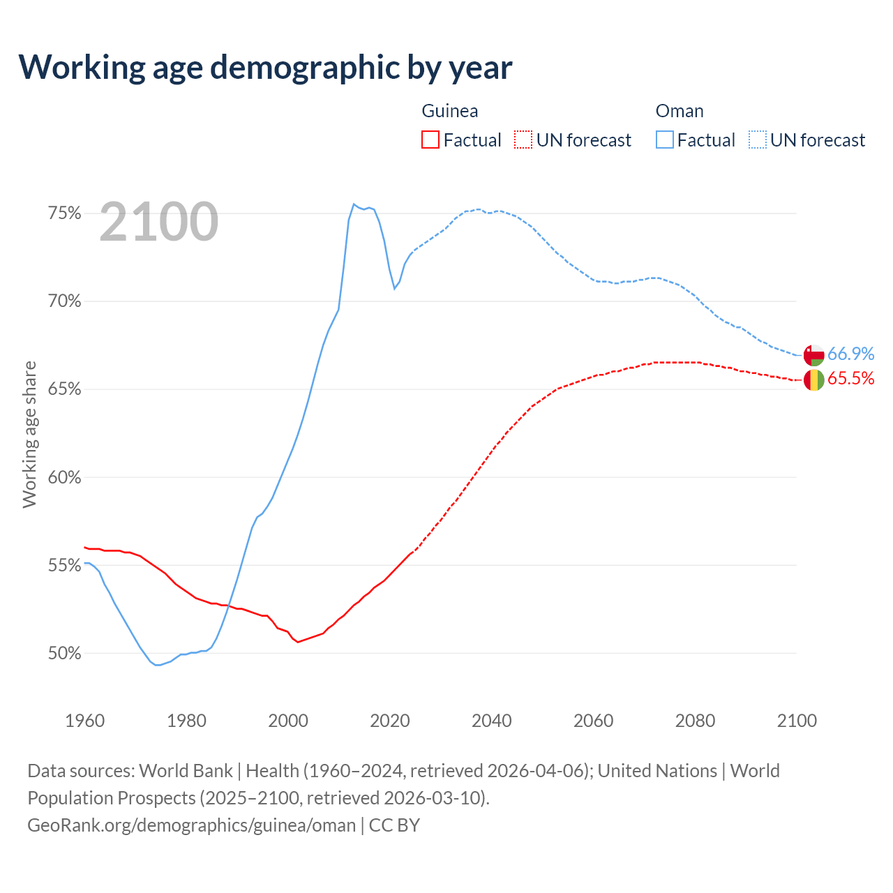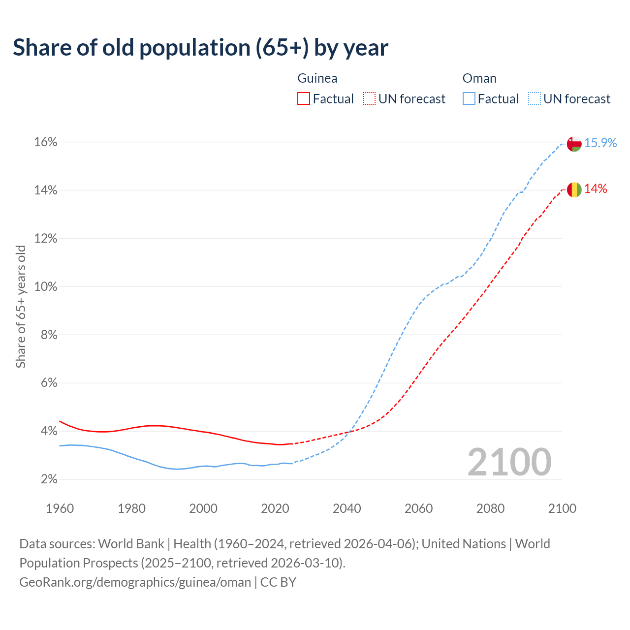 The share of older people aged 65 and over is 3.46% in Guinea and 2.64% in Oman. Life expectancy in Guinea compared to Oman .