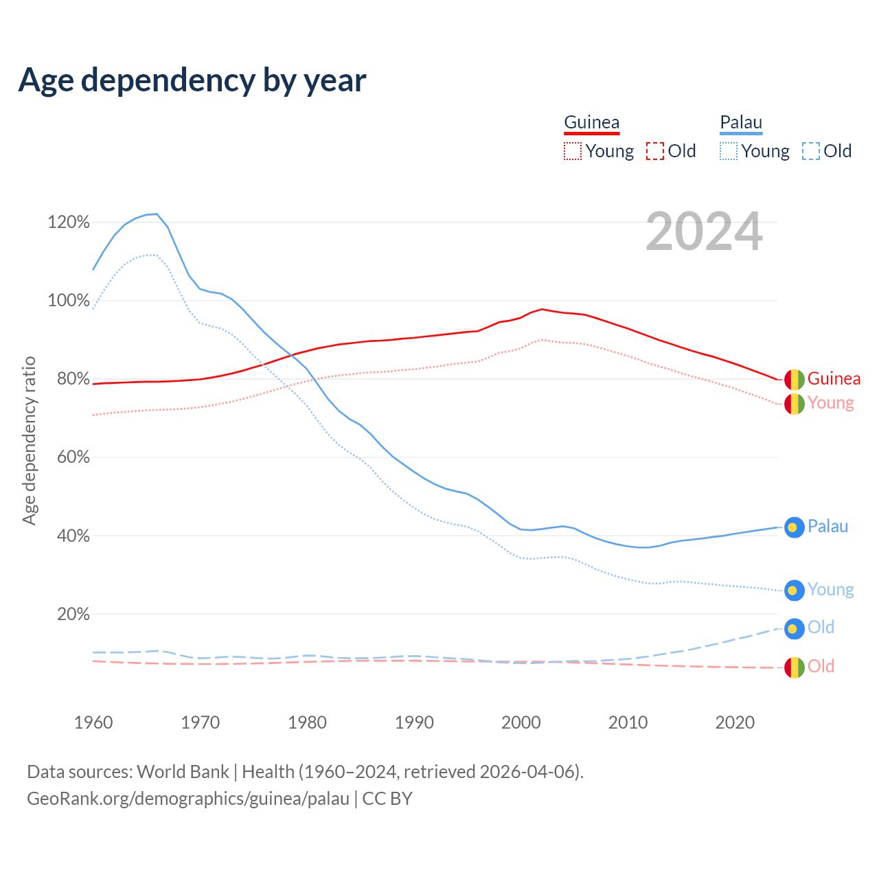 - The share of old-age demographic (65+) in Guinea is 3.46% vs 11.3% in Palau.