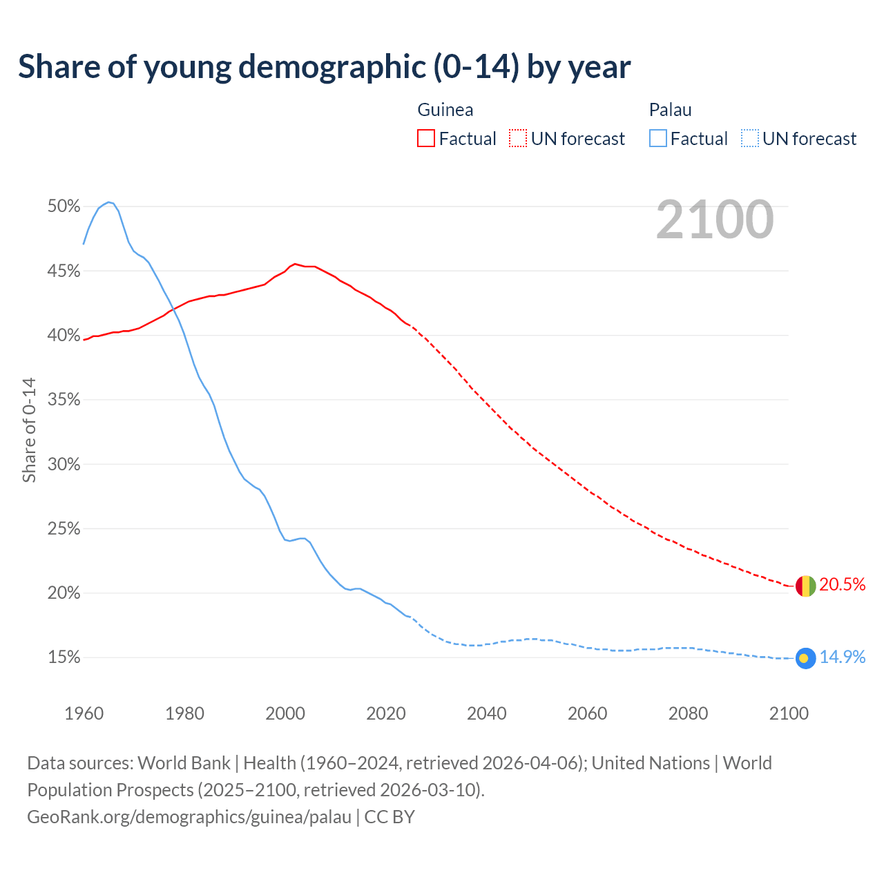 - The share of young demographic (0-15 years old) in Guinea is 40.9% vs 18.2% in Palau.