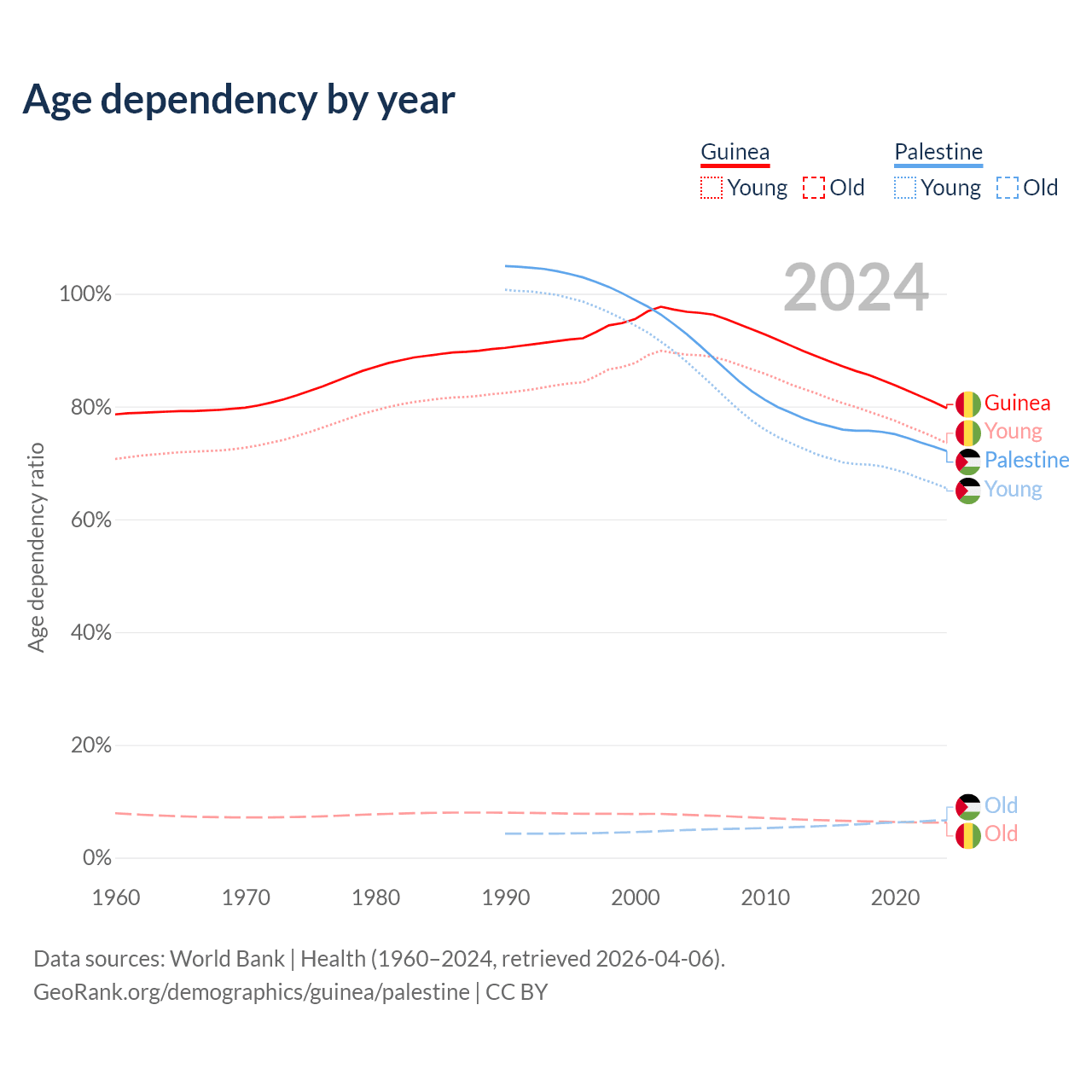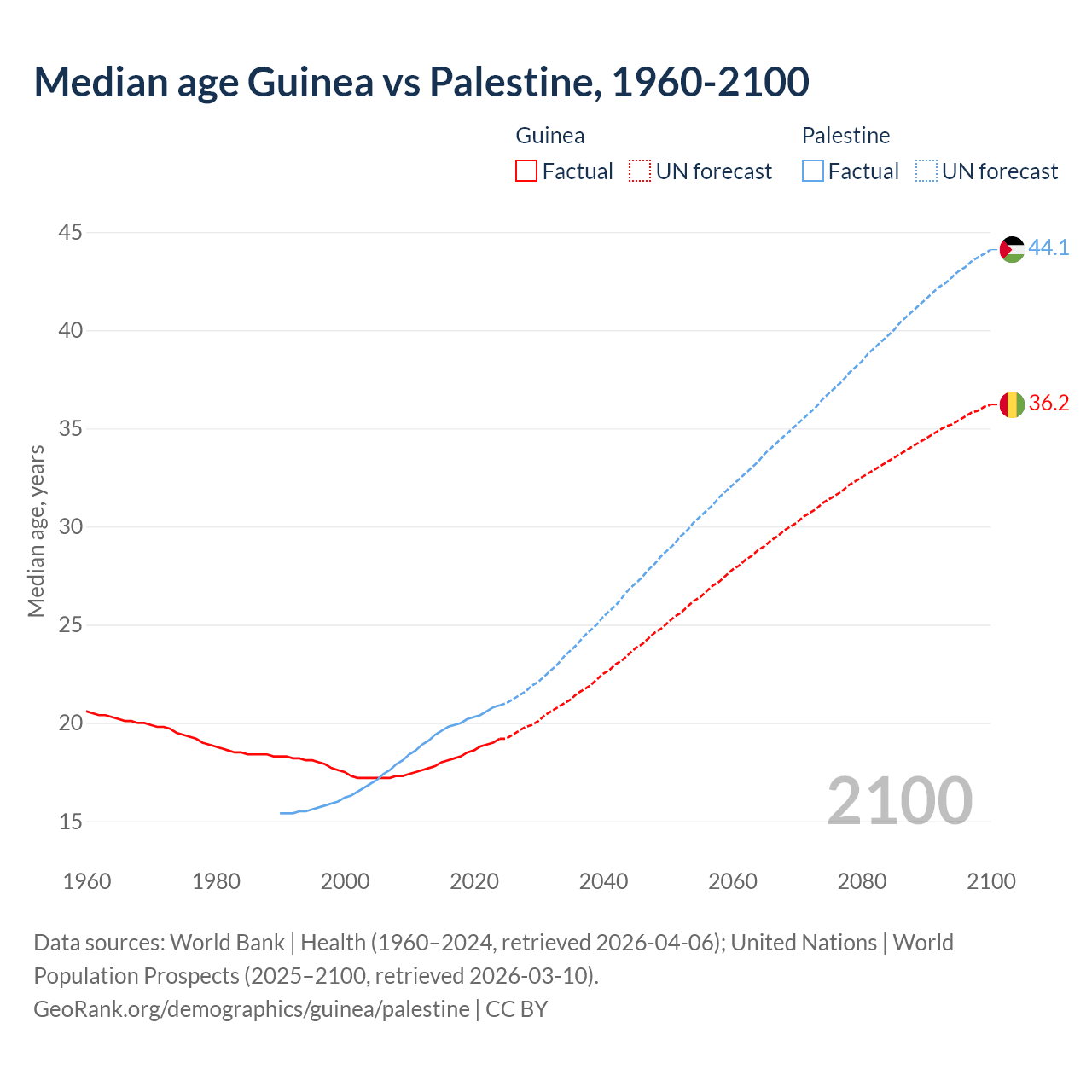 - Guinea is ranked 176/196 by median age (oldest to youngest) vs 157/196 for Palestine.