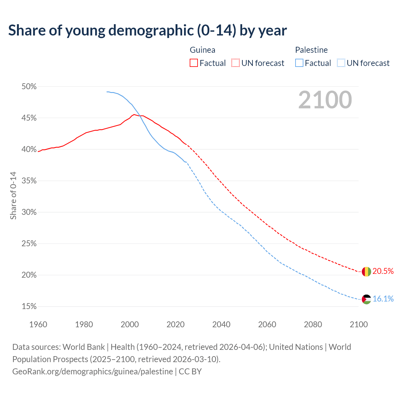 - The share of young demographic (0-15 years old) in Guinea is 40.9% vs 38% in Palestine.