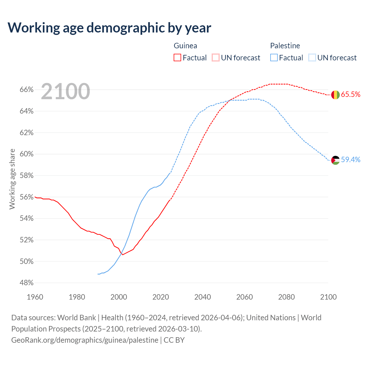 - Guinea has 8.65M working age adults (aged 15-64) vs 3.2M in Palestine.