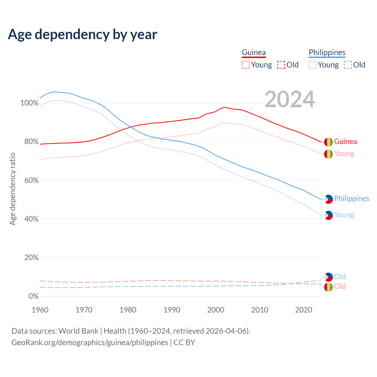 - Guinea is ranked 176/196 by median age (oldest to youngest) vs 123/196 for the Philippines.