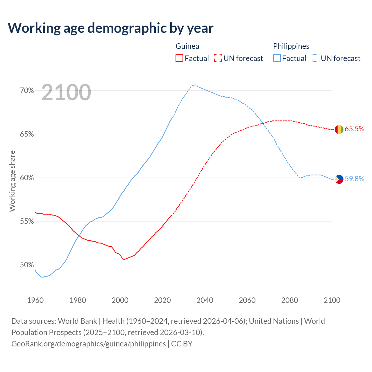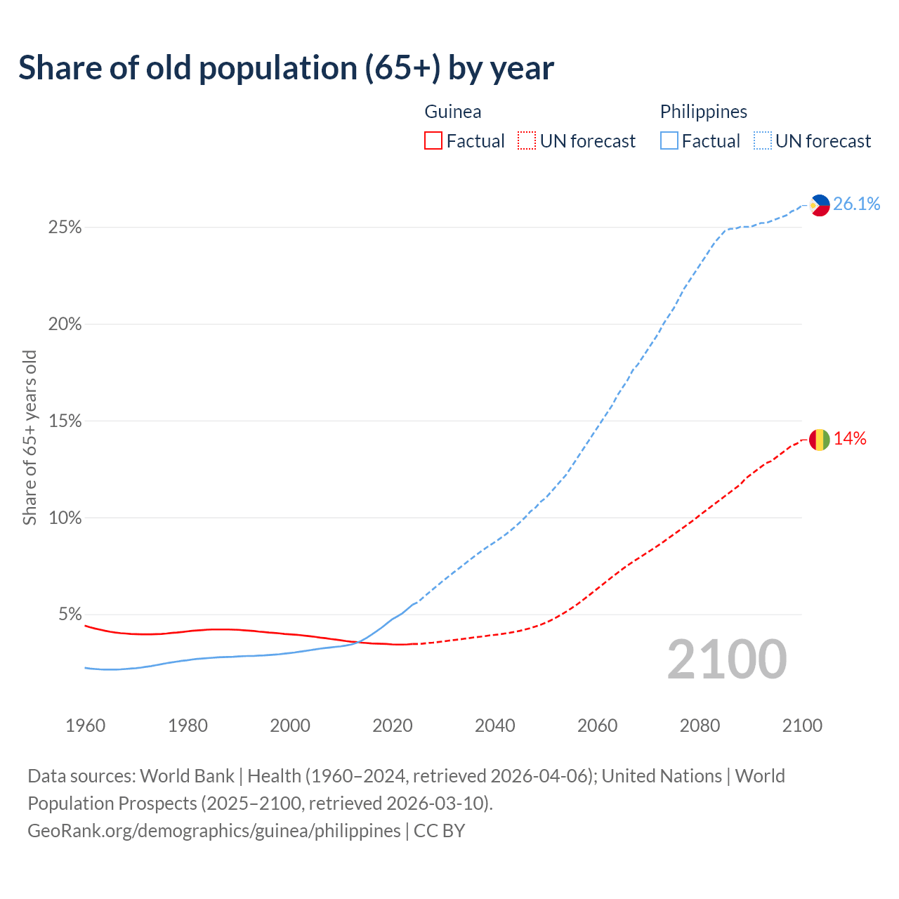 Median age Guinea vs Philippines, 1960-2100