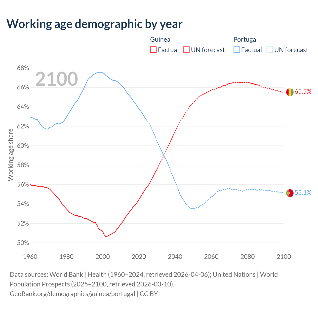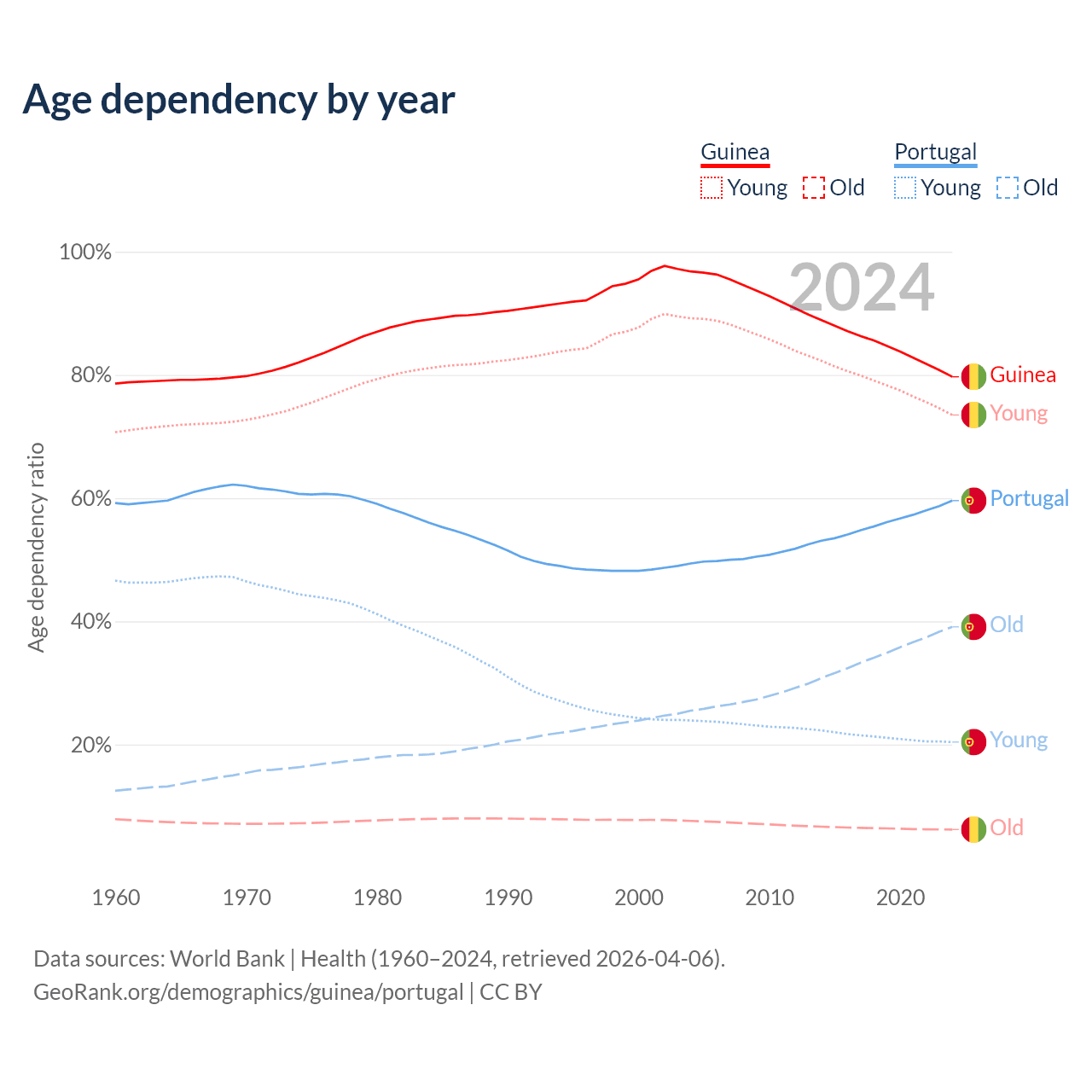 - The share of old-age demographic (65+) in Guinea is 3.46% vs 24.5% in Portugal.