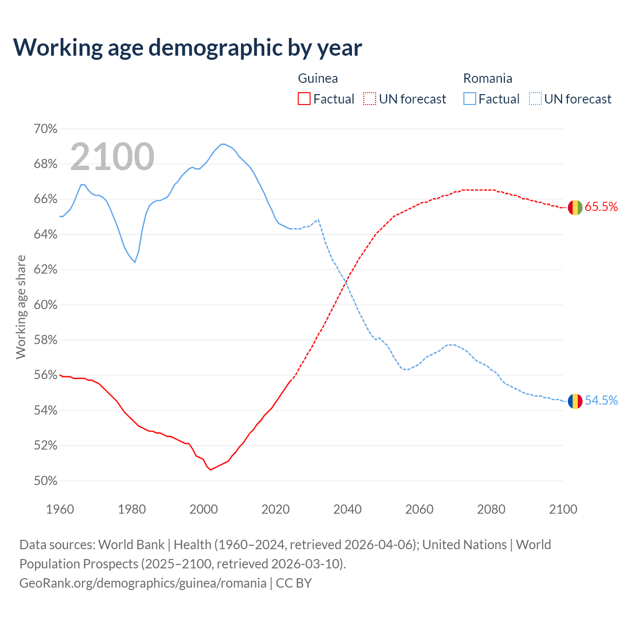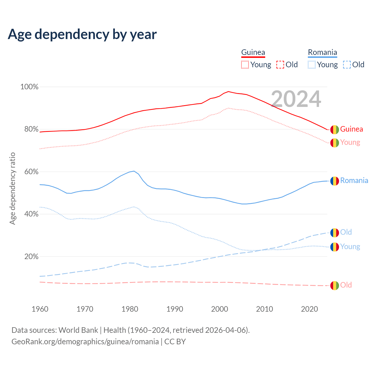 The share of older people aged 65 and over is 3.46% in Guinea and 20% in Romania. Life expectancy in Guinea compared to Romania .