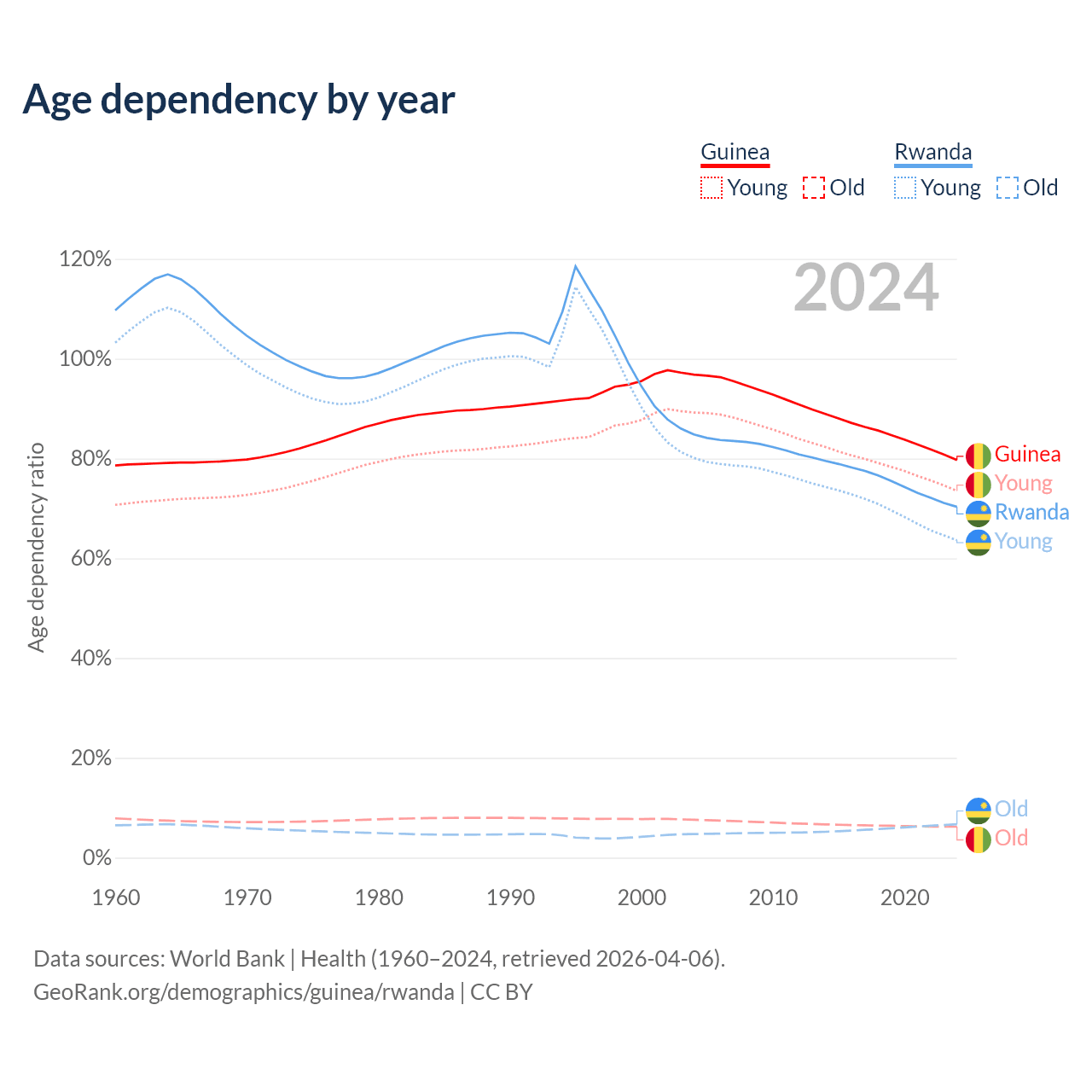 - Guinea is ranked 176/196 by median age (oldest to youngest) vs 160/196 for Rwanda.