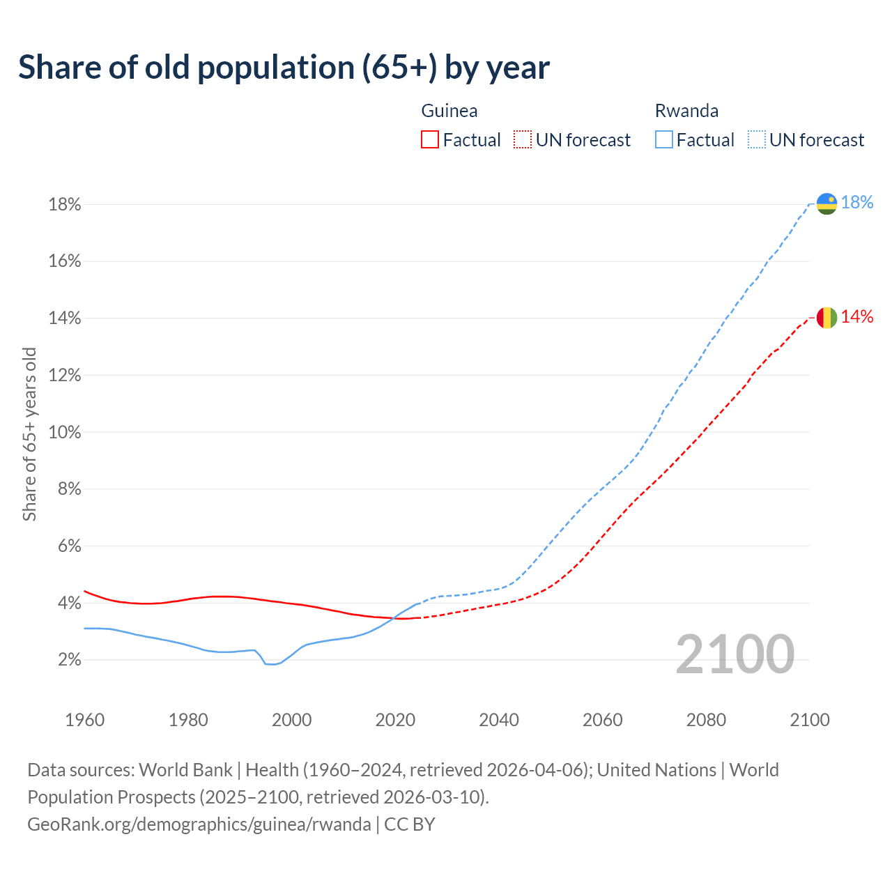 - The share of old-age demographic (65+) in Guinea is 3.46% vs 3.93% in Rwanda.