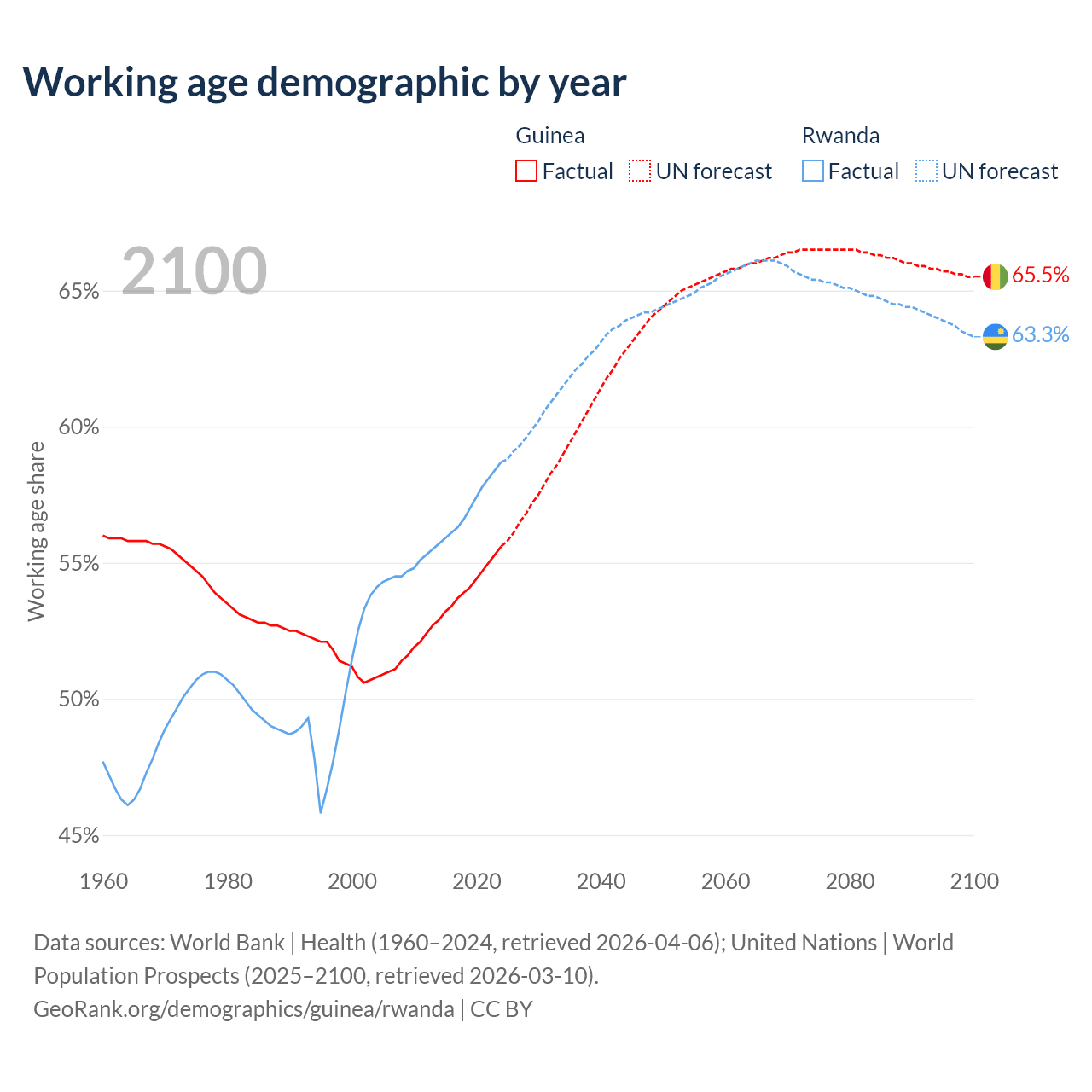 - Guinea has 8.65M working age adults (aged 15-64) vs 8.79M in Rwanda.