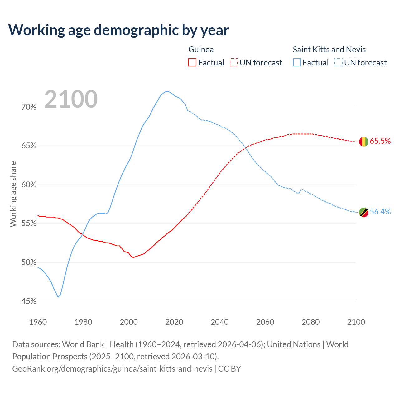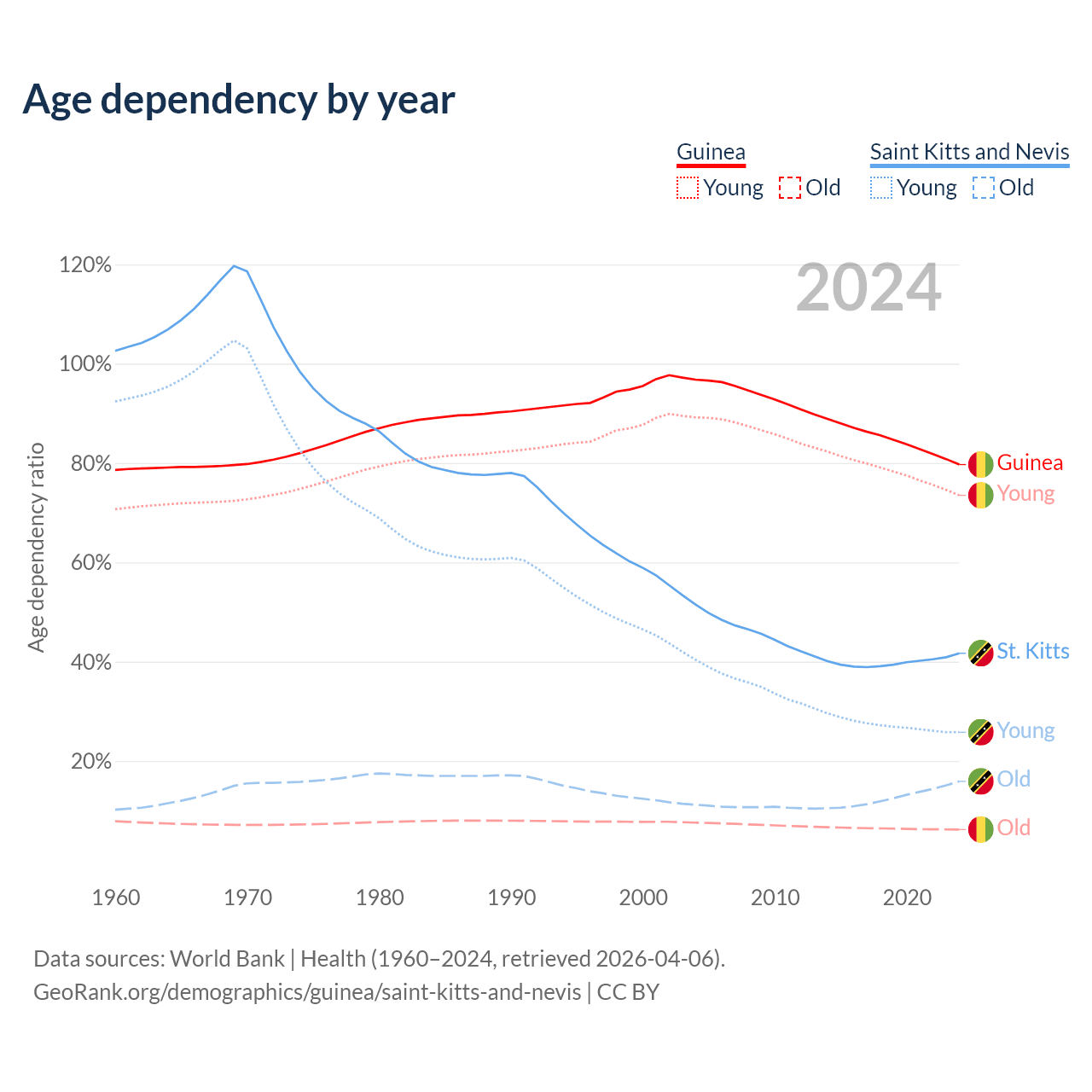 - The share of old-age demographic (65+) in Guinea is 3.46% vs 11.2% in Saint Kitts and Nevis.