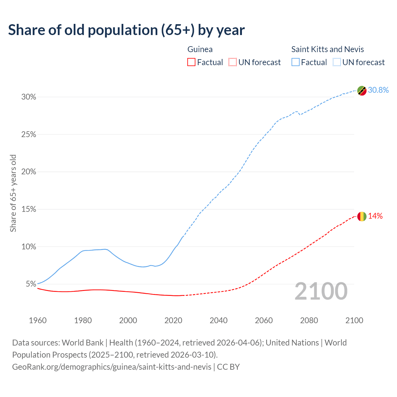 The share of older people aged 65 and over is 3.46% in Guinea and 11.2% in Saint Kitts and Nevis. Life expectancy in Guinea compared to Saint Kitts and Nevis .