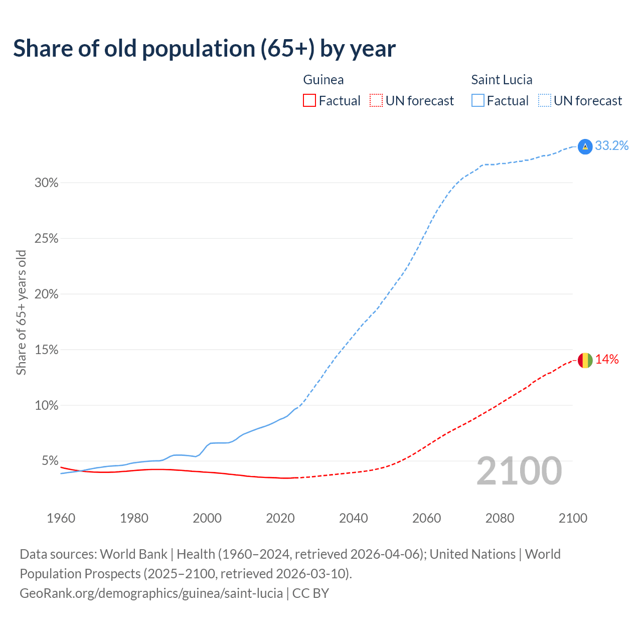 - The share of old-age demographic (65+) in Guinea is 3.46% vs 9.62% in Saint Lucia.